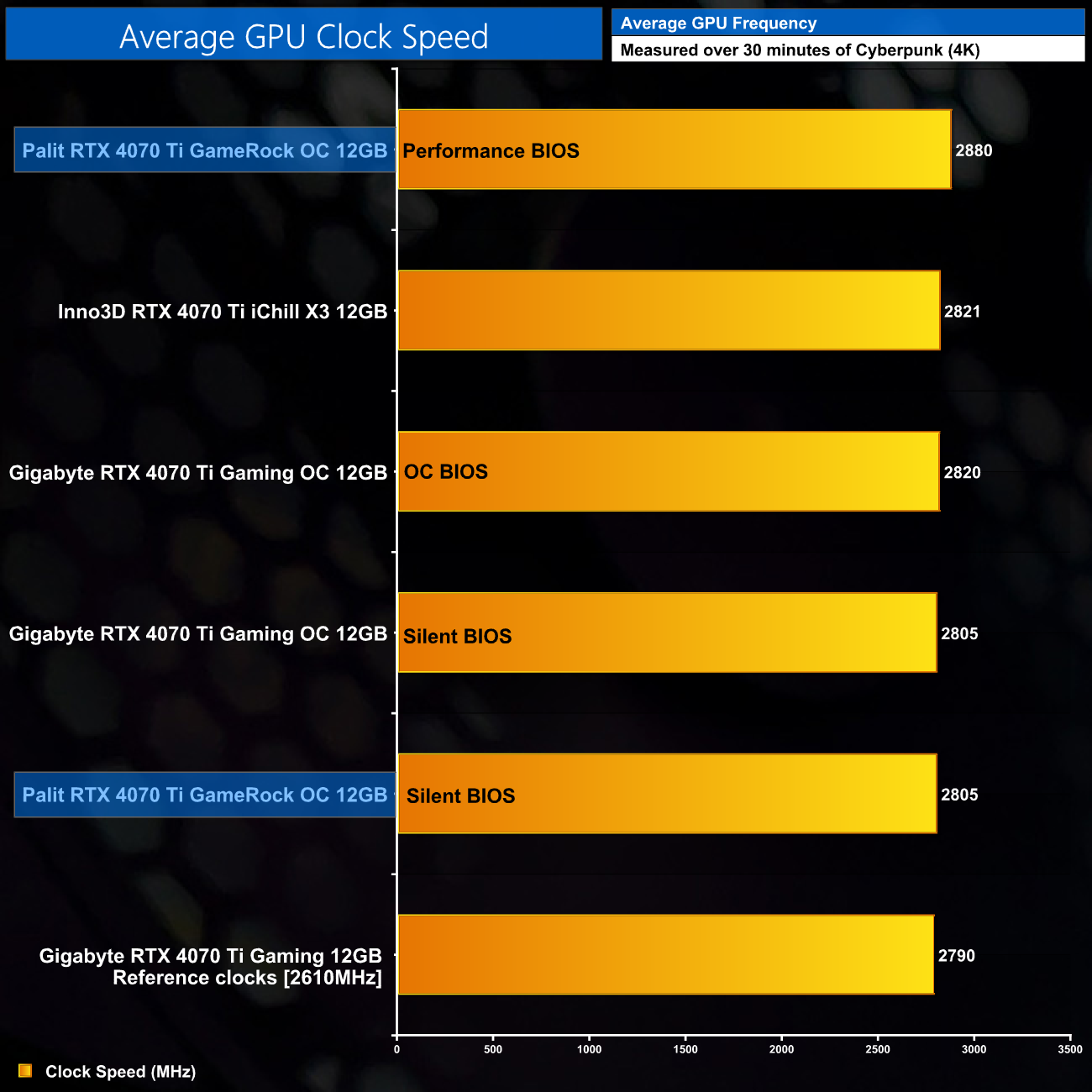 Here we present the average clock speed for each graphics card while running Cyberpunk 2077 for 30 minutes. We use GPU-Z to record the GPU core frequency during gameplay. We calculate the average core frequency during the 30 minute run to present here.