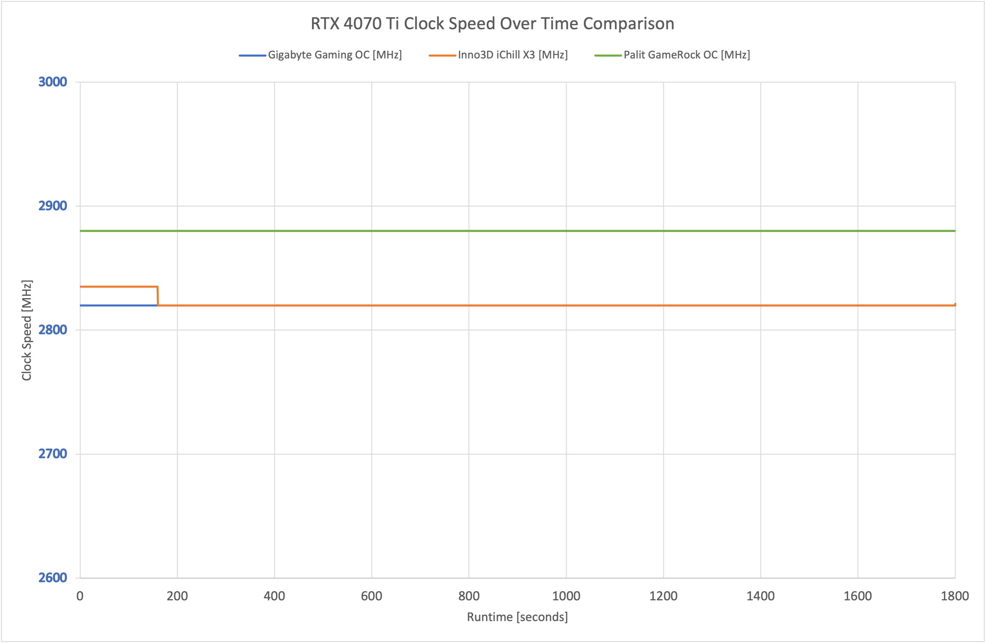 Even with a 165MHz factory overclock, in the real world the GameRock OC averaged 2880MHz over our thirty minute stress test, making it just 60MHz faster than the Inno3D iChill X3 and Gigabyte Gaming OC. It is faster, yes, but only by a very small margin.