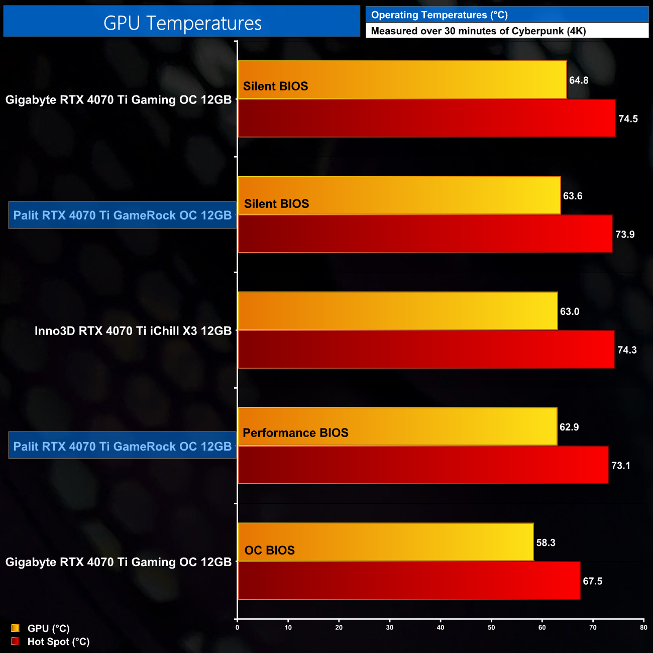 As for thermal performance, there isn't a whole lot between the three cards we have tested. The Palit GameRock OC saw peak GPU temperatures around the 63C mark, which is a very good place to be, with the hot spot running at 73-74C. There's also very little difference between the Performance and Silent BIOS, as despite the names, the fan curve is almost identical between the two as we will see shortly.