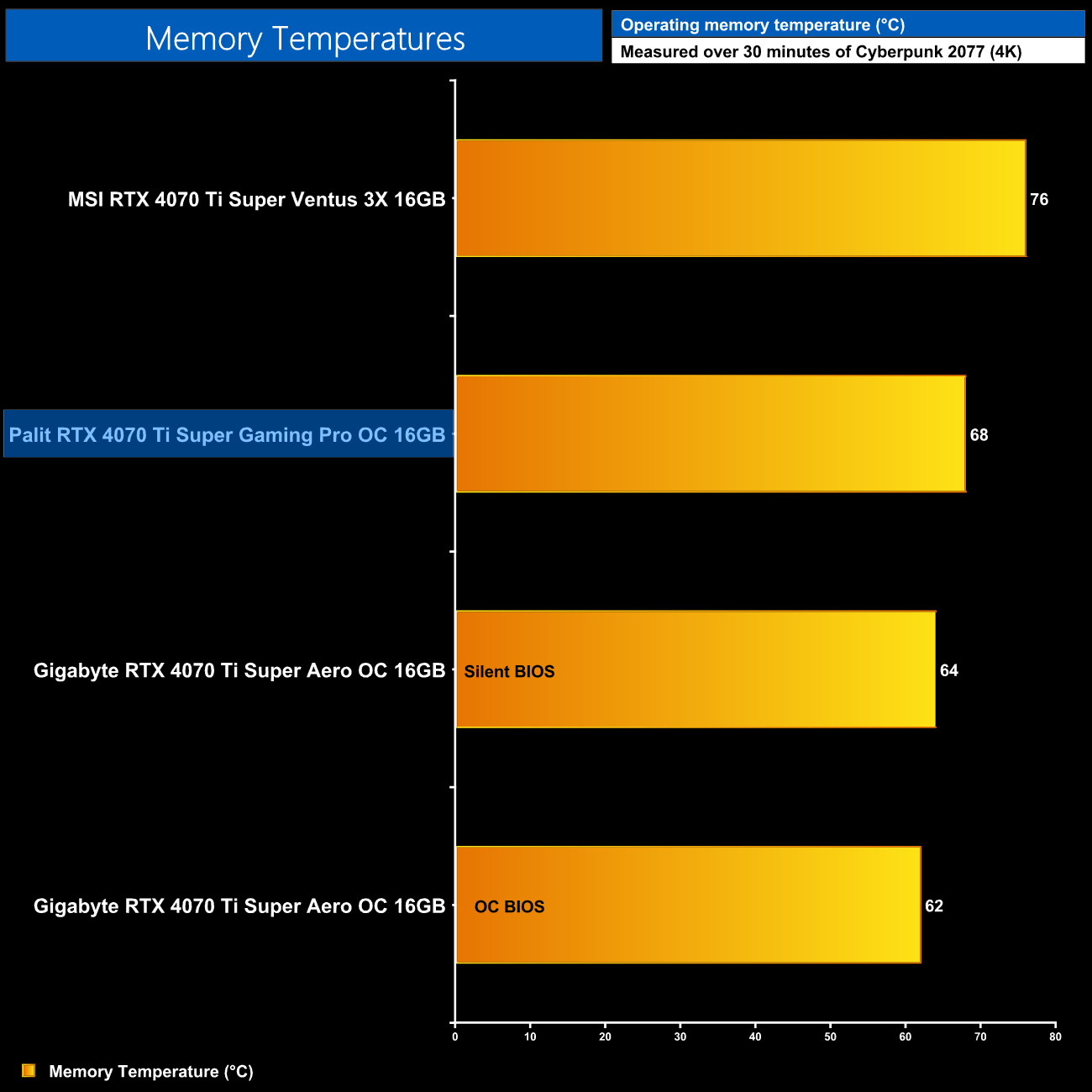 For our memory temperature testing, we measure the peak memory temperature under load. A reading under load comes from running Cyberpunk 2077 for 30 minutes.