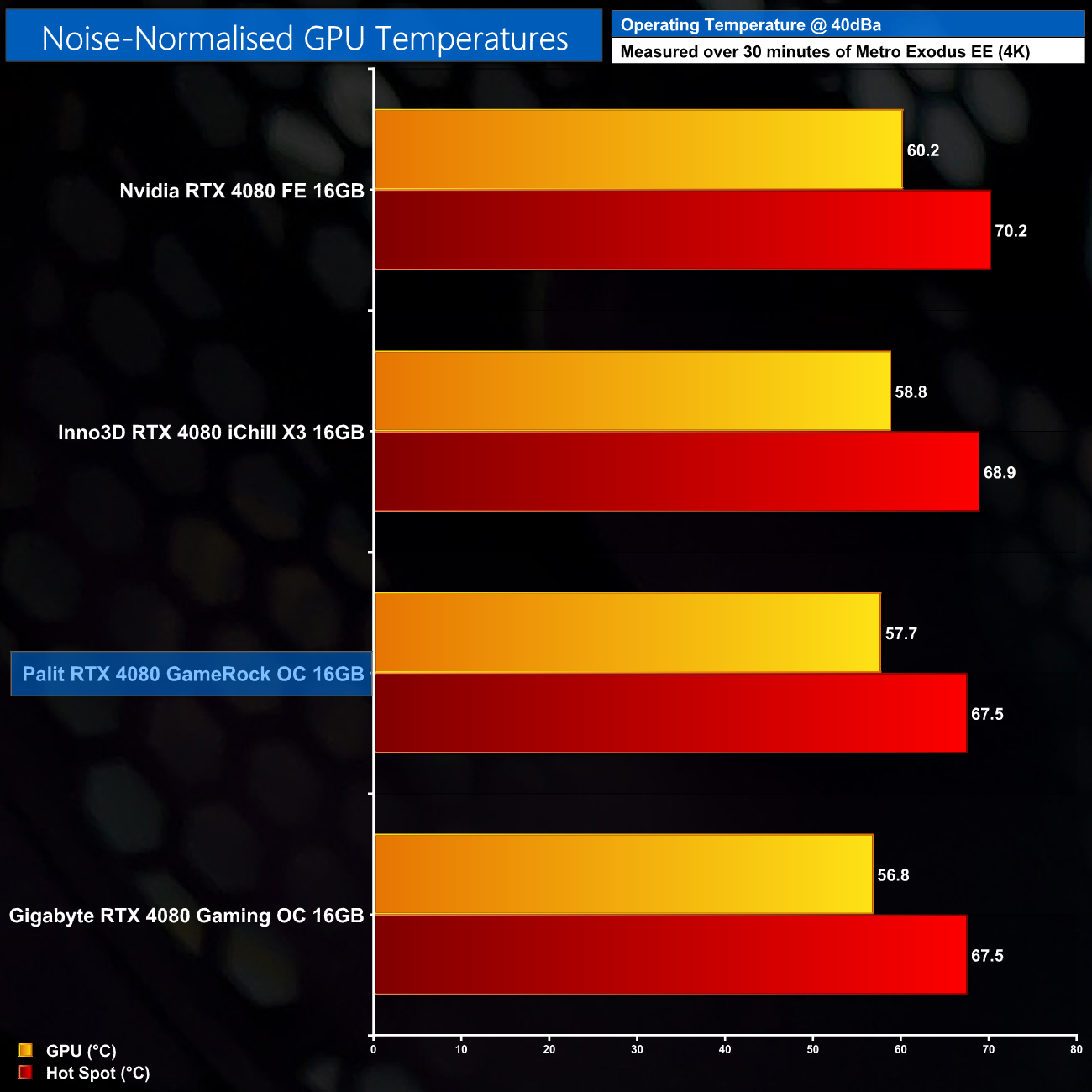 Following on from our stock thermal and acoustic testing, here we re-test the operating temperature of the GPU, but with noise levels normalised to 40dBa. This allows us to measure the efficiency of the overall cooling solution as varying noise levels as a result of more aggressive fan curves are no longer a factor.