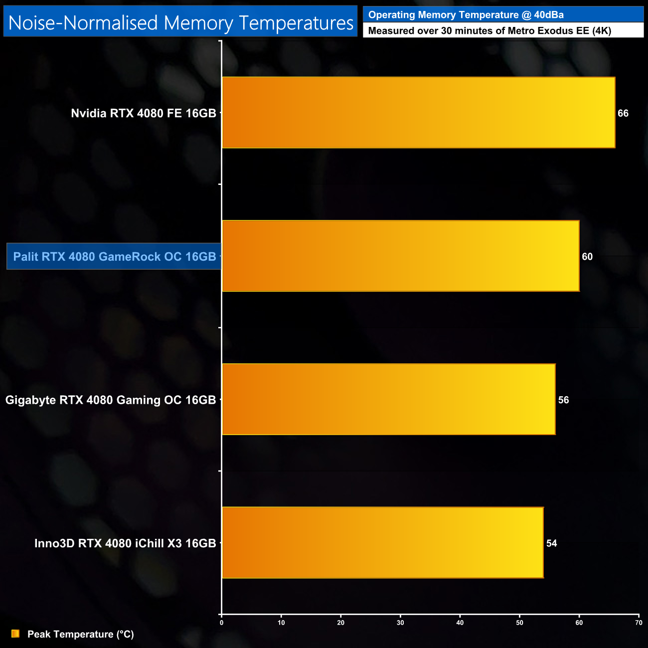 We had to increase fan speed up to 1880rpm to hit 40dBa, and this saw noise-normalised GPU temperatures drop to 57.7C, putting it within 1C of the Gigabyte Gaming OC, so it's certainly an efficient cooler. The memory thermals are still slightly warmer, but at 60C it's still a good result, even if the Gaming OC and iChill X3 are a bit cooler.