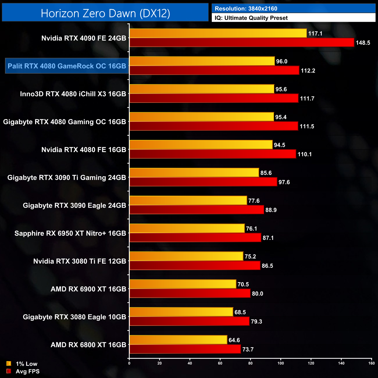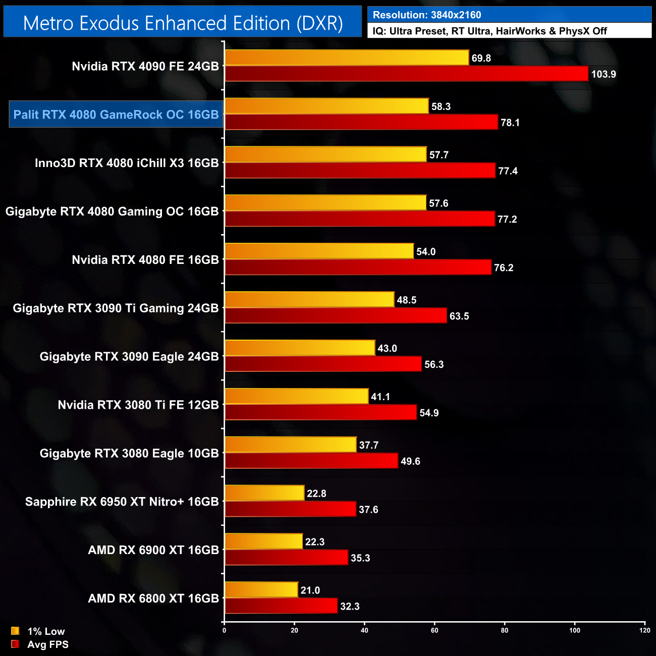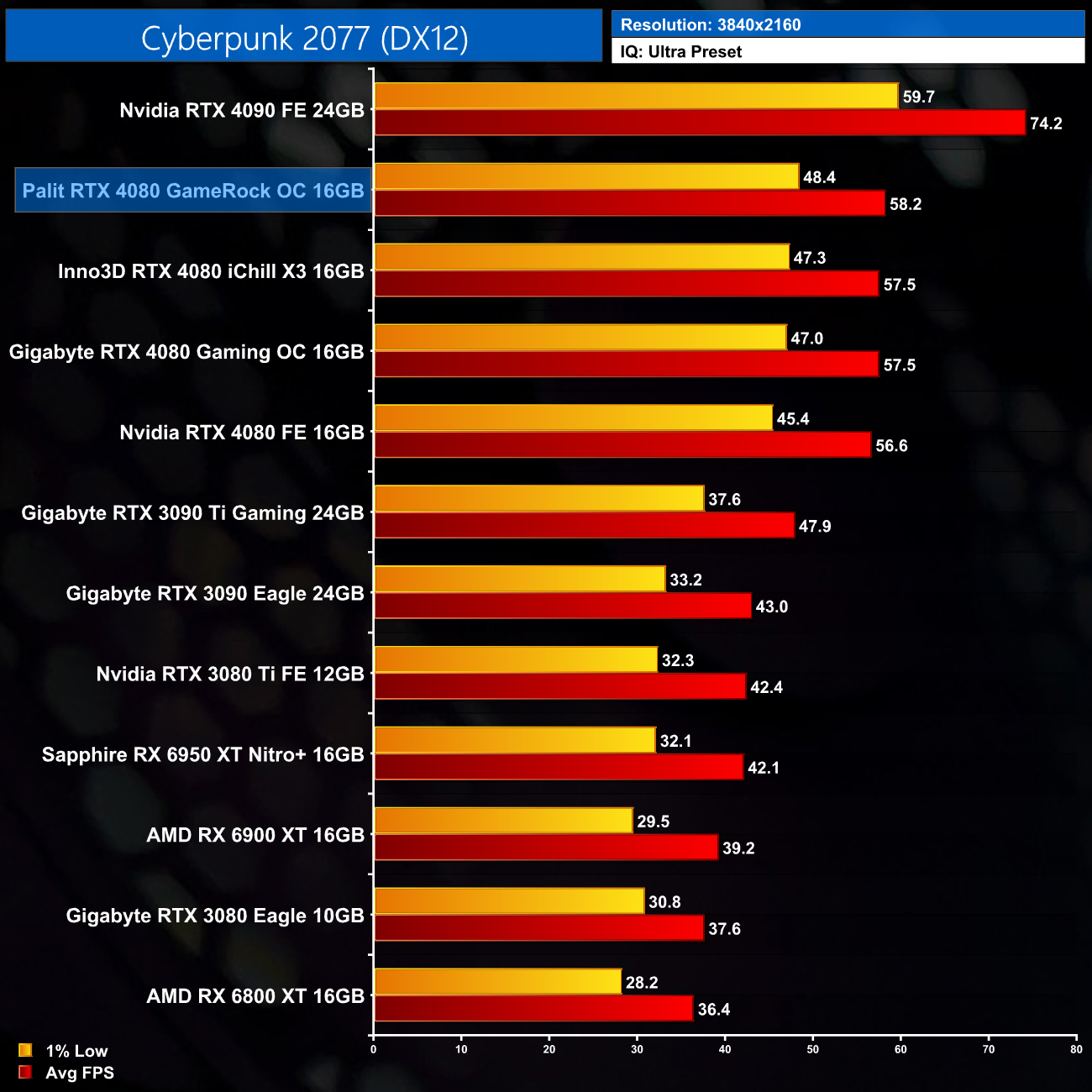 In terms of gaming performance, the GameRock OC did prove to be the fastest-running RTX 4080 we have tested so far. The margins are very slim however, as the GameRock was never more than 3% faster than the Founders Edition – so we're talking differences of just 3-4FPS at most.