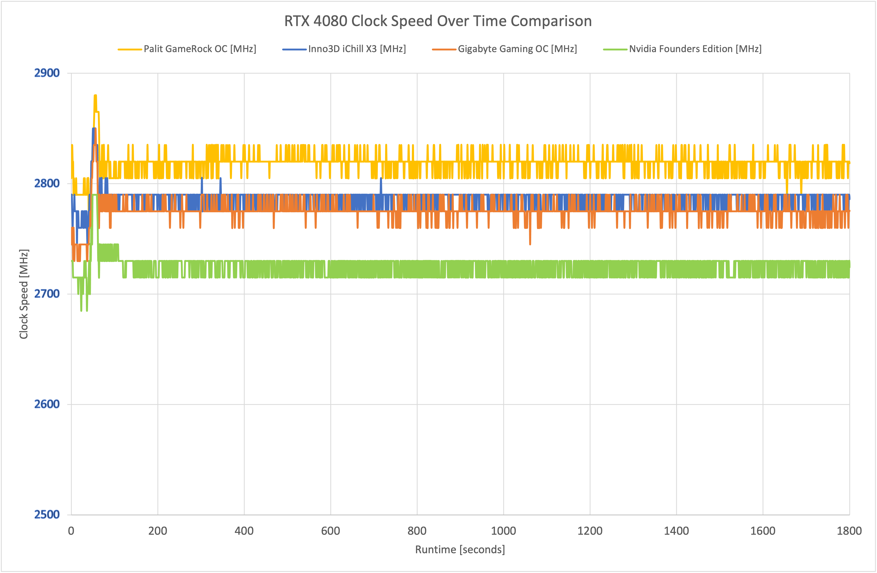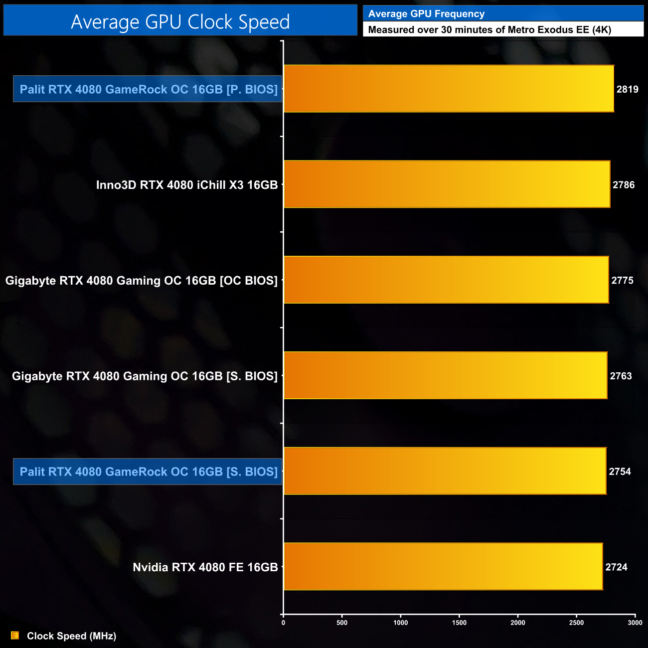 The GameRock OC did clock the highest, explaining the small performance advantage it has in games. Over our thirty minute stress test, the card averaged 2819MHz using the Performance BIOS, so that's about 30MHz faster than the Inno3D iChill X3 and almost 100MHz faster than the Founders Edition.