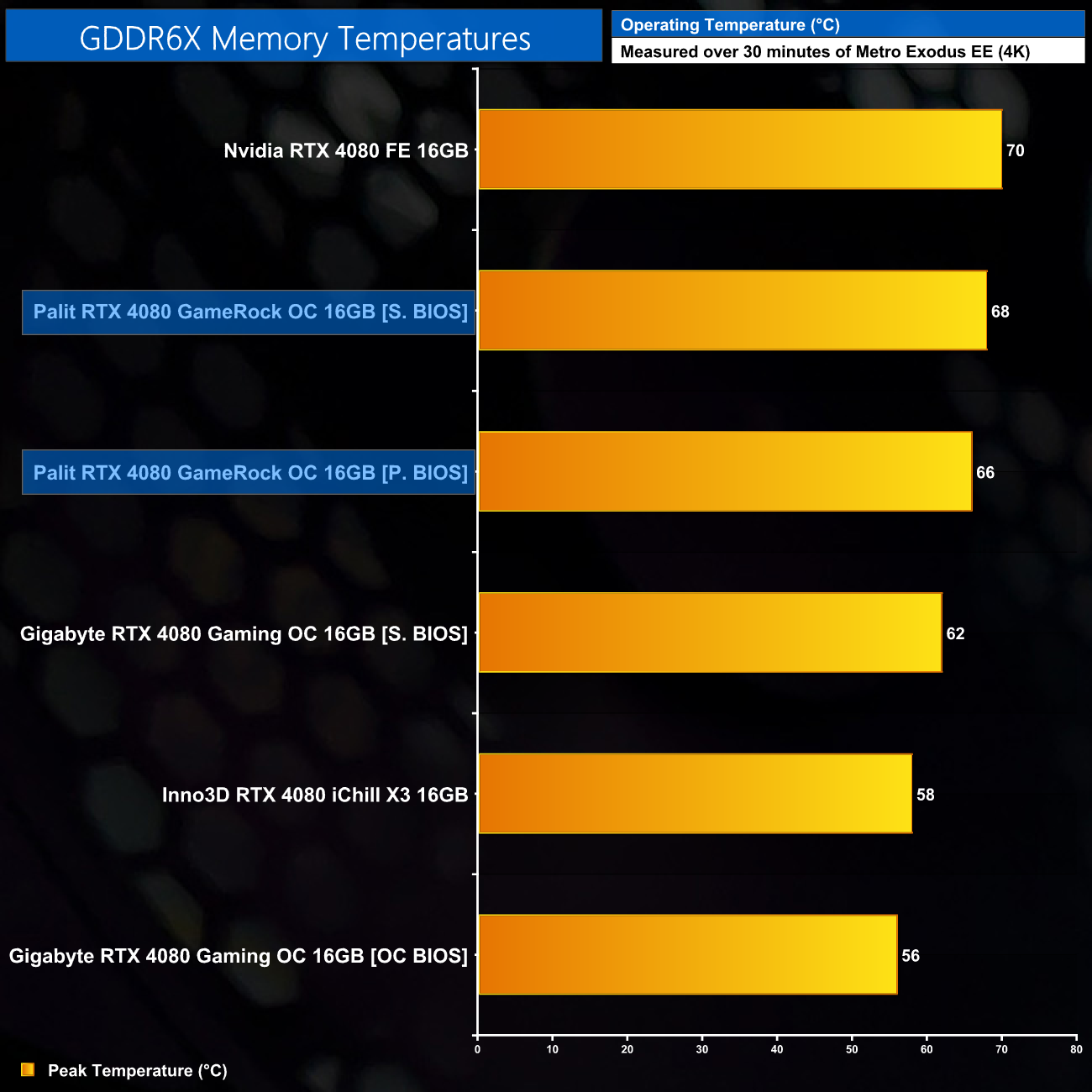 For our temperature testing, we measure the peak memory temperature under load. A reading under load comes from running Metro Exodus Enhanced Edition for 30 minutes.