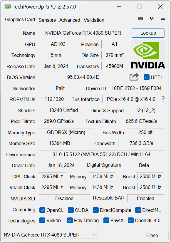 TSMC's N4 node has Nvidia cranking up the clock speed significantly this generation, with the RTX 4080 Super sporting a 2550MHz rated boost. That's 45MHz faster than the rated clock speed of the RTX 4080, though Palit has added an extra 25MHz on top.
