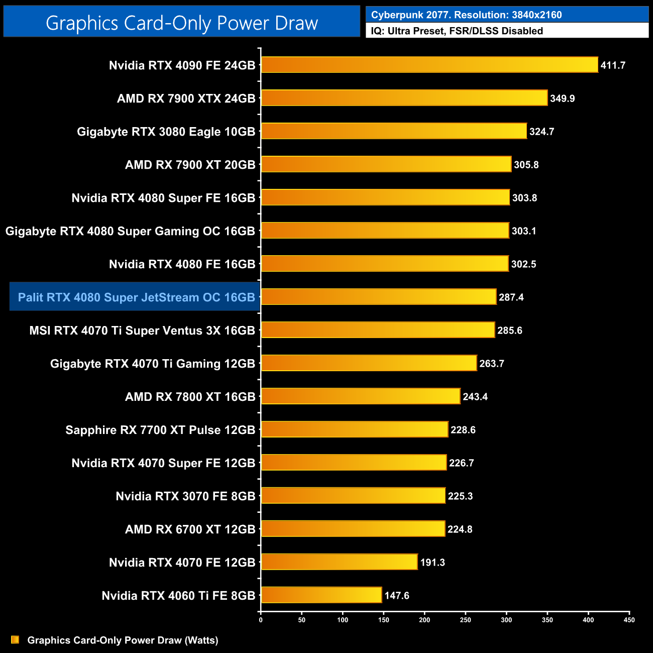 We use Nvidia PCAT to measure power draw of the graphics card only, with readings from both the PCIe slot and the PCIe power cables combined into a single figure. We use Cyberpunk 2077 (1440p) for this testing.