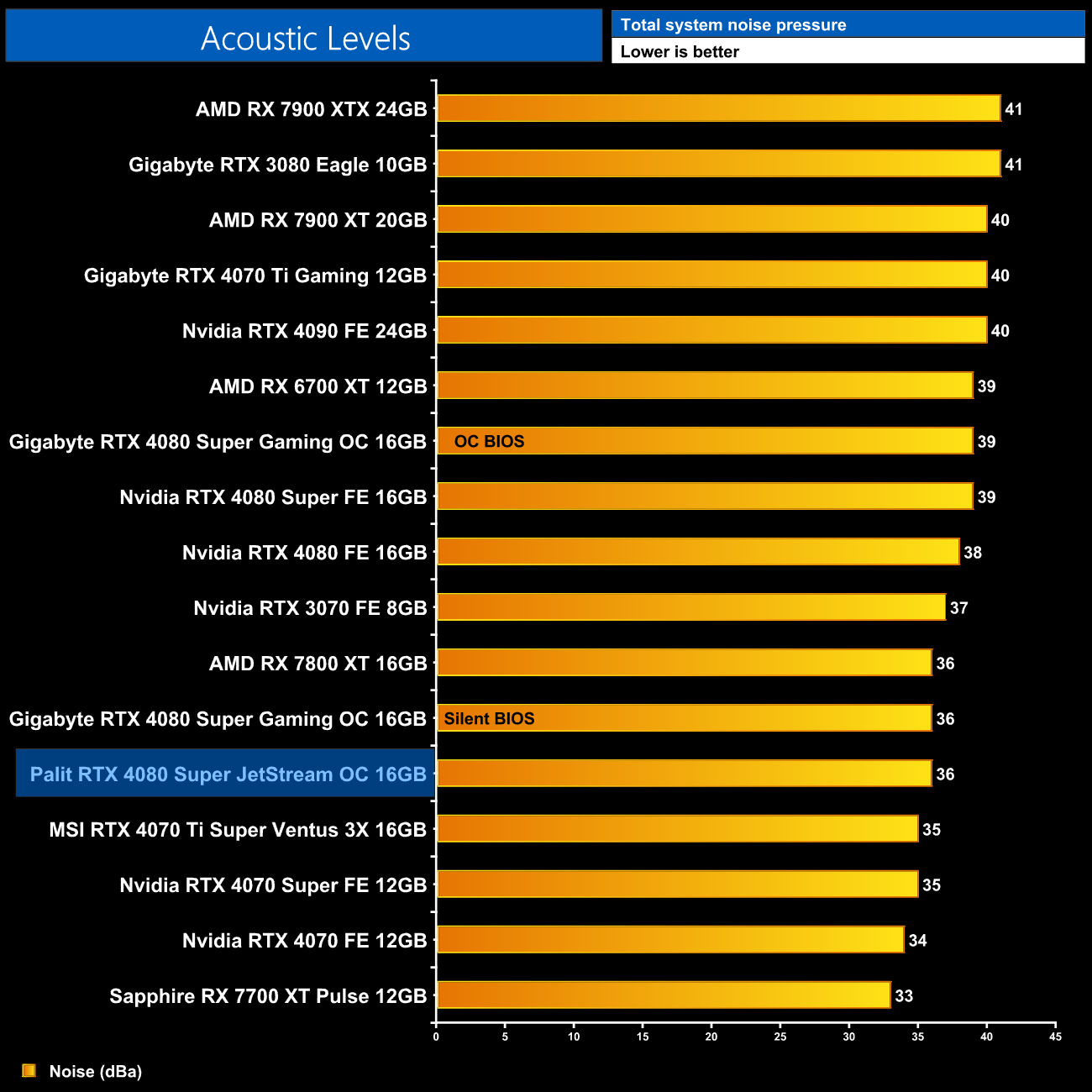 The JetStream OC impresses with its out of the box noise levels, peaking at just 36dBa in my testing. This was with the three fans running at 37%, or just 1400rpm, putting it on par with the Gaming OC's Silent BIOS.