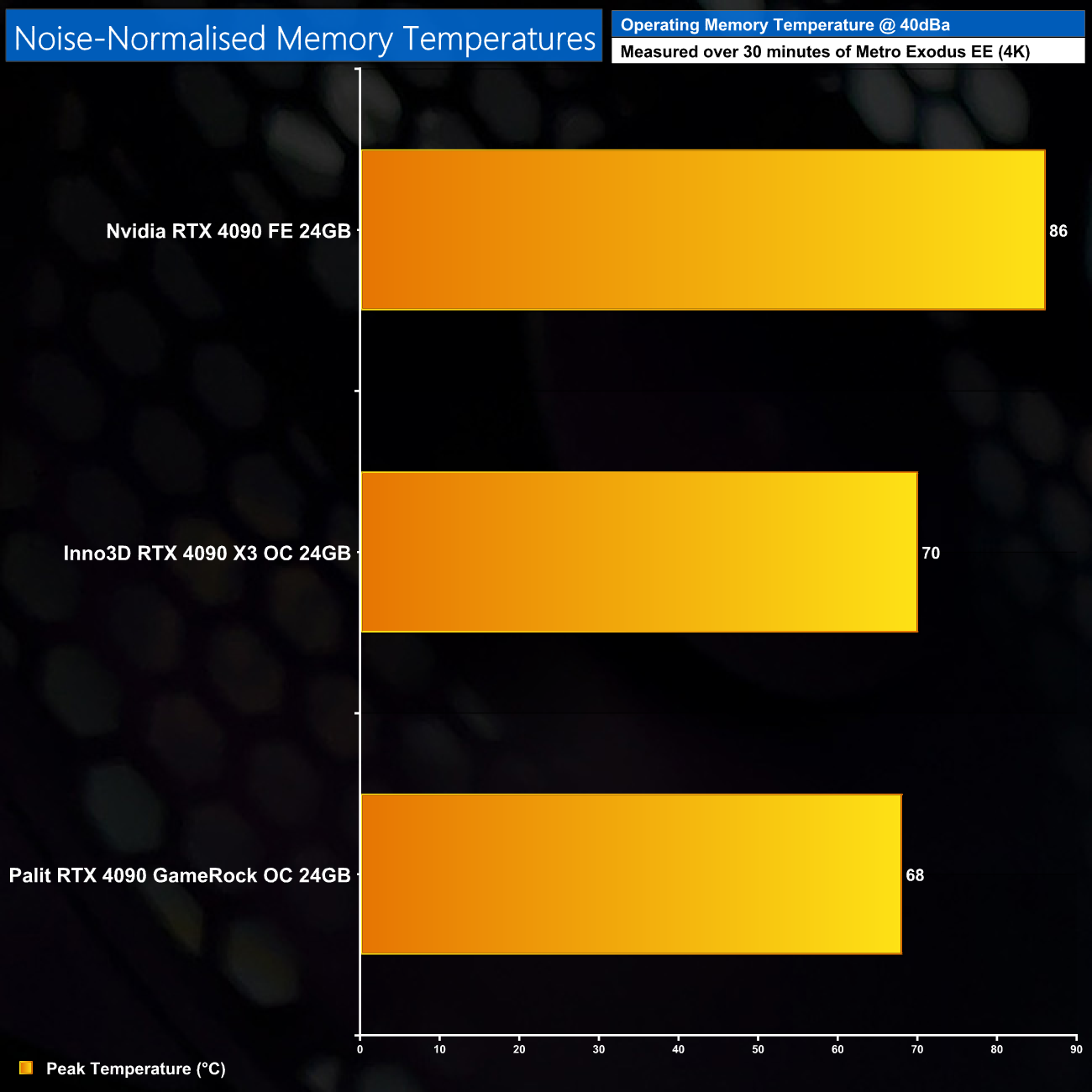 To hit 40dBa noise output, we increased fan speed up to 1780rpm, or 48%. That resulted in the best RTX 4090 thermal performance yet, with the GPU at 61.8c and the Hot Spot at 69.5C, making it about 2c cooler than the Inno3D X3 OC. Memory thermals, meanwhile, hit 68C, so that's another 2 degree reduction against the Inno3D.