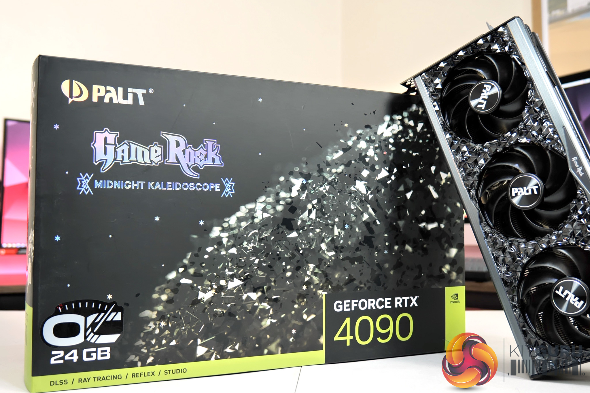 The Palit RTX 4090 GameRock OC ships in a glittering black box, featuring the GameRock logo and the ‘midnight kaleidoscope' branding.