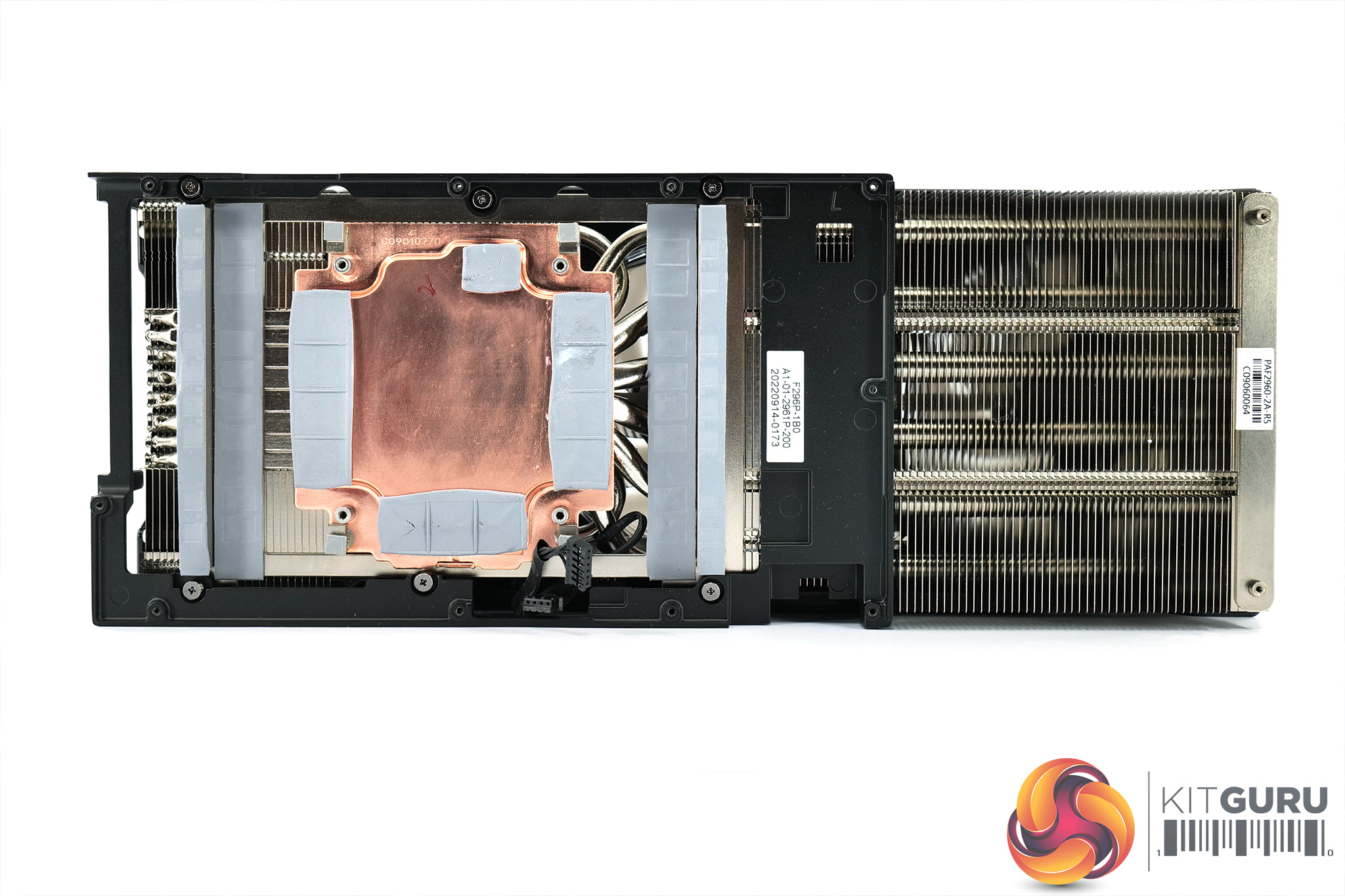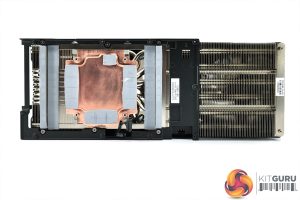 As for the cooler, Palit is another company to use a vapour chamber, this time with a copper base that contacts both the GPU die and memory. The vapour chamber sits on top of 8 heatpipes, four measuring 6mm and four 8mm thick, utilising a hefty aluminium finstack for heat dispersal. An additional coldplate is mounted onto the finstack that contacts with the VRM.