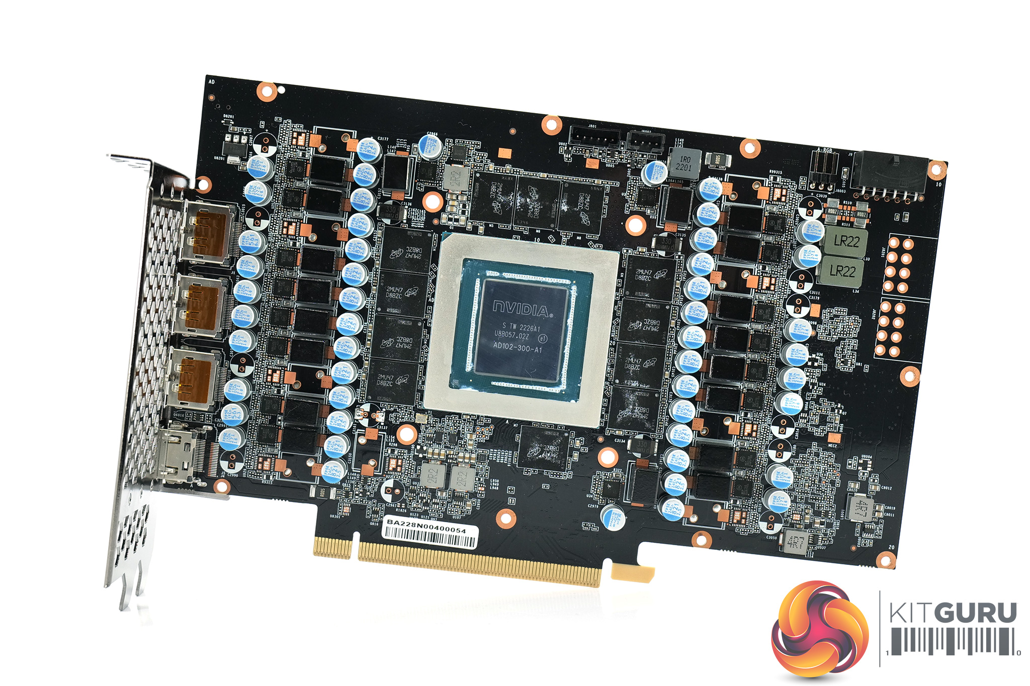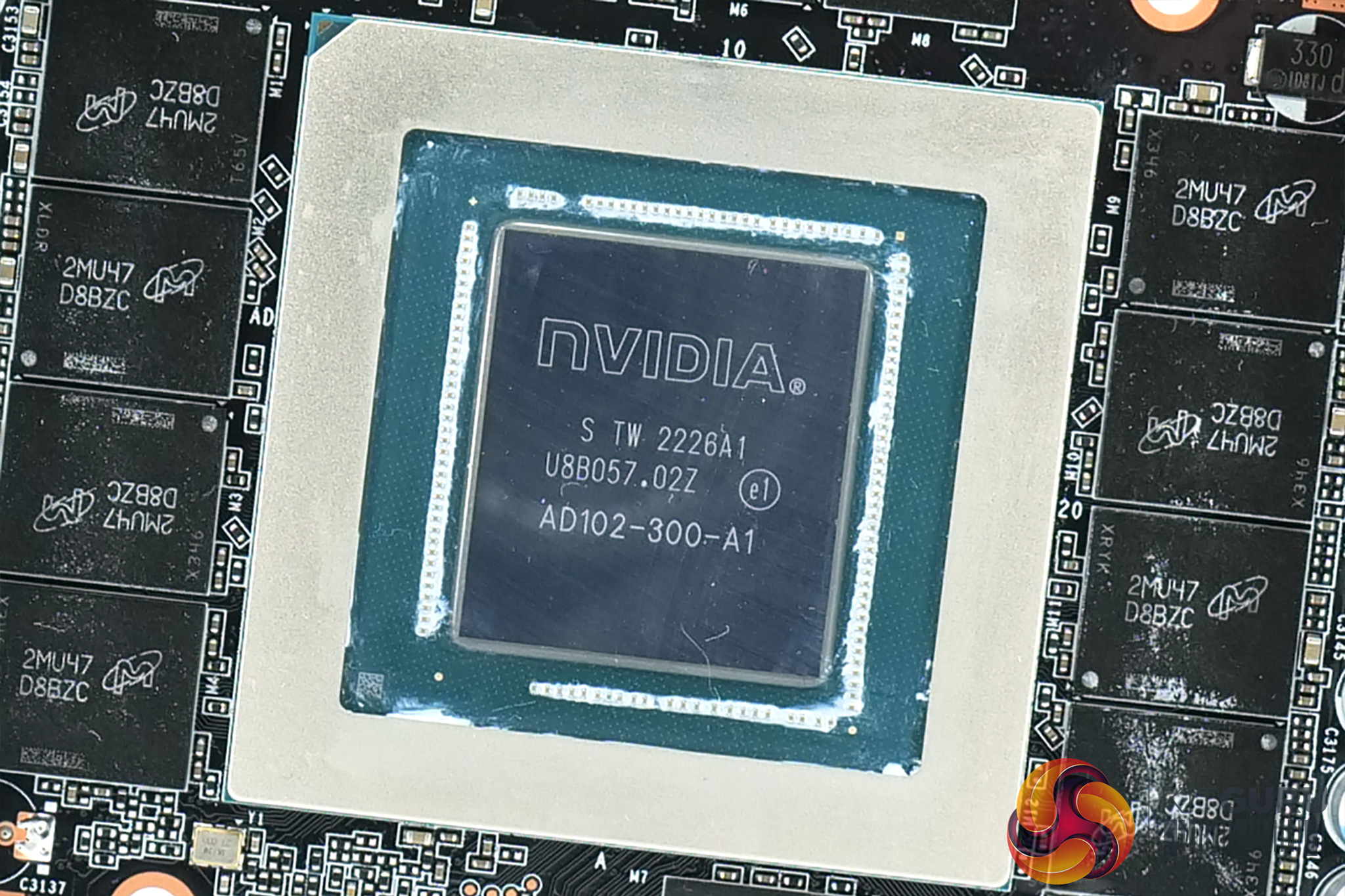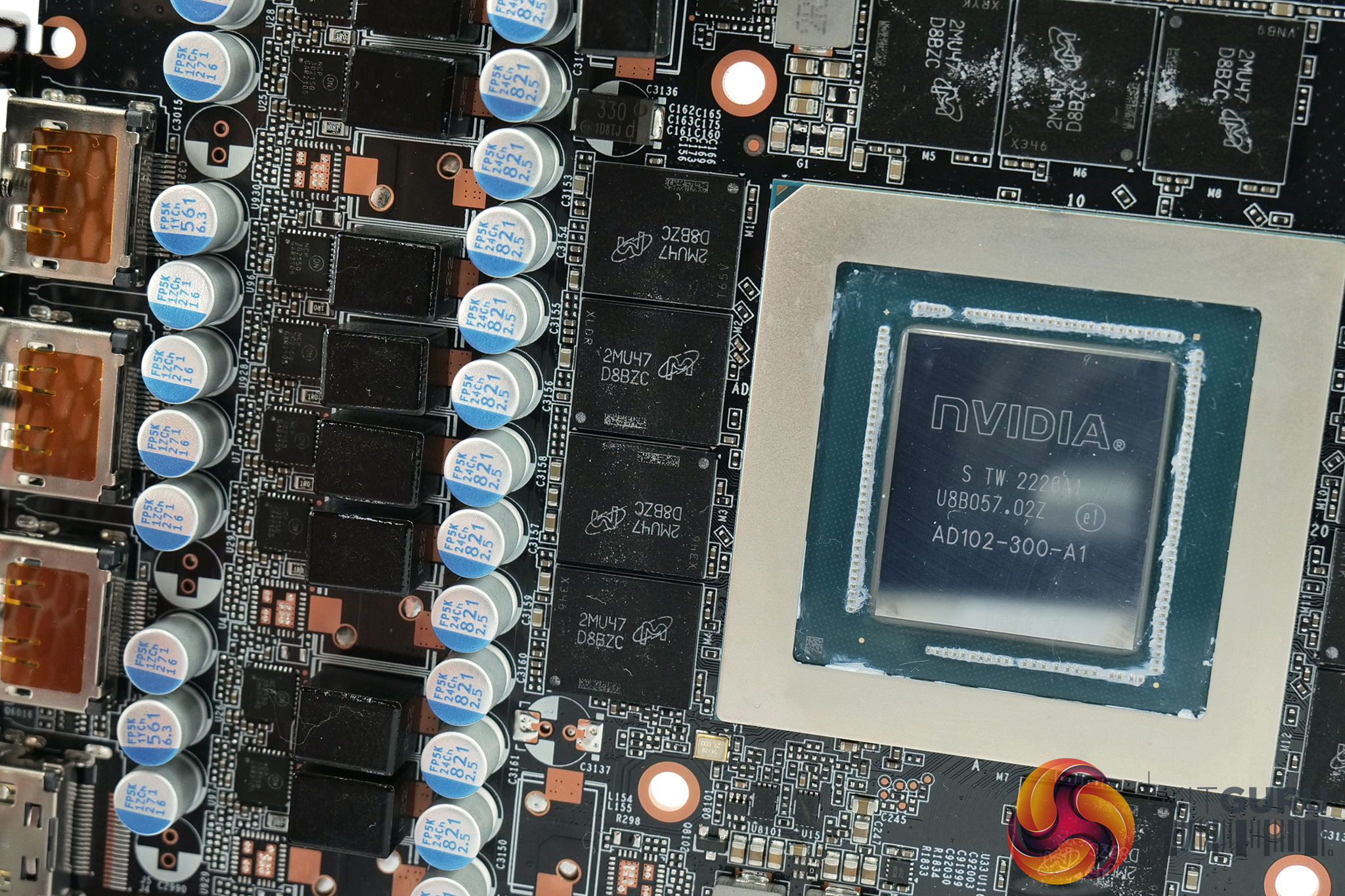 We can note the 12 GDDR6X memory modules, manufactured by Micron – model number 2MU57D8BZC. The AD102 GPU takes pride of place, measuring 608mm2.