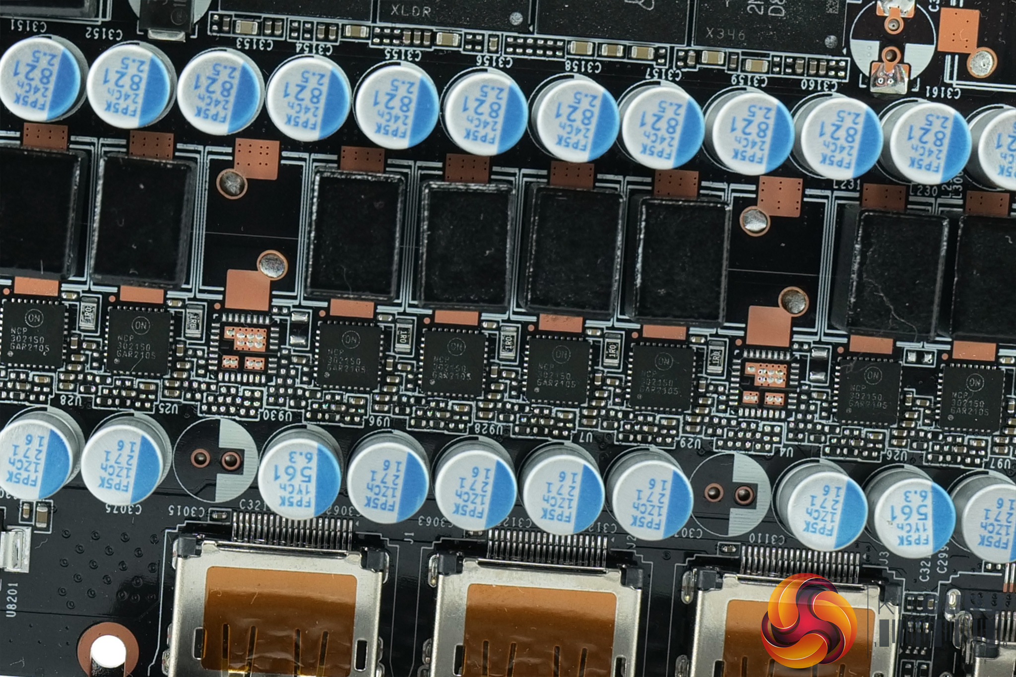 Removing the cooler to look at the PCB, we can see Palit has opted for a 16-phase VRM for the GPU and a 3-phase VRM for the memory, using 50A ONSemi NCP302150 MOSFETs. Two UPI UP9512 controllers are used.