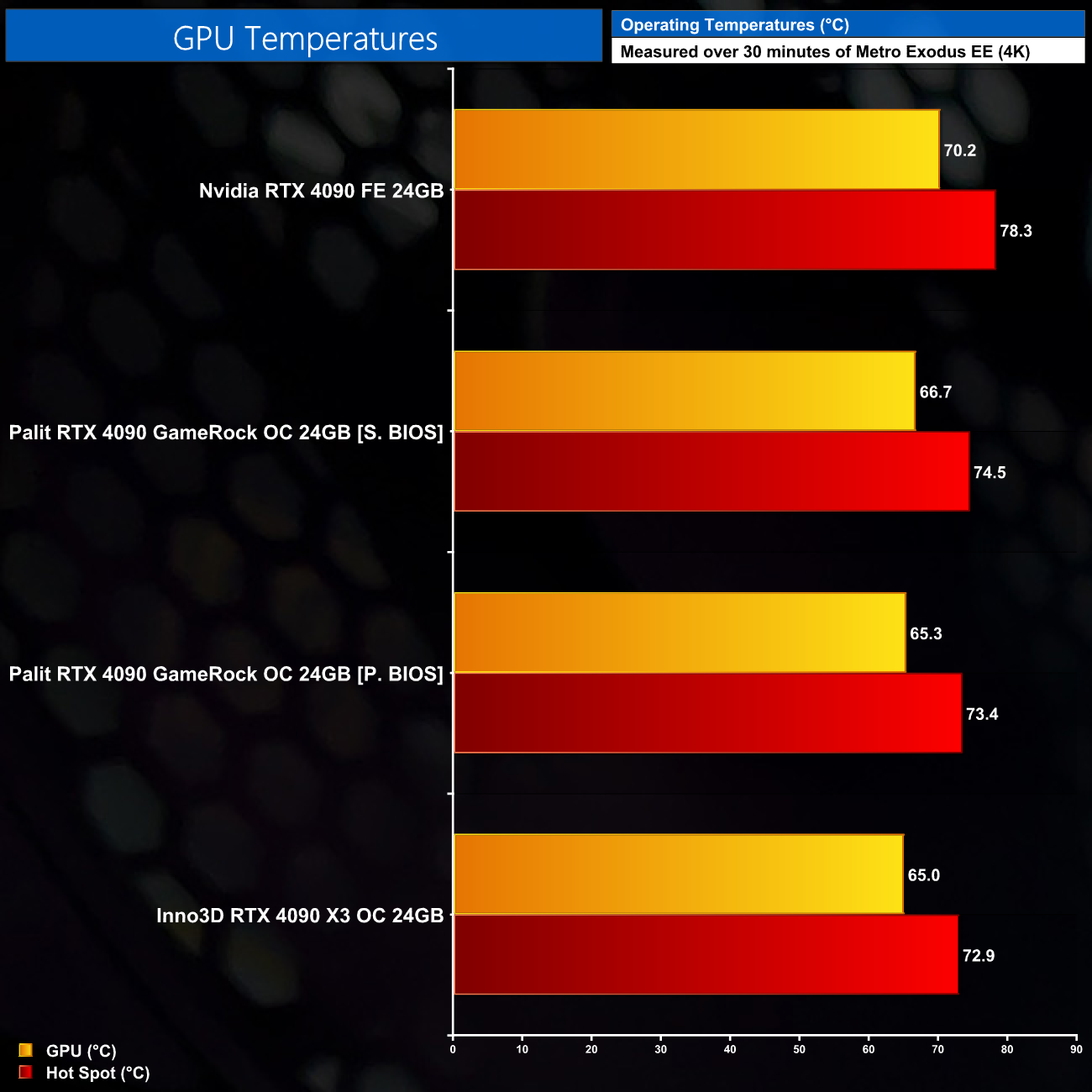 For our temperature testing, we measure the peak GPU core temperature under load. A reading under load comes from running Metro Exodus Enhanced Edition for 30 minutes.