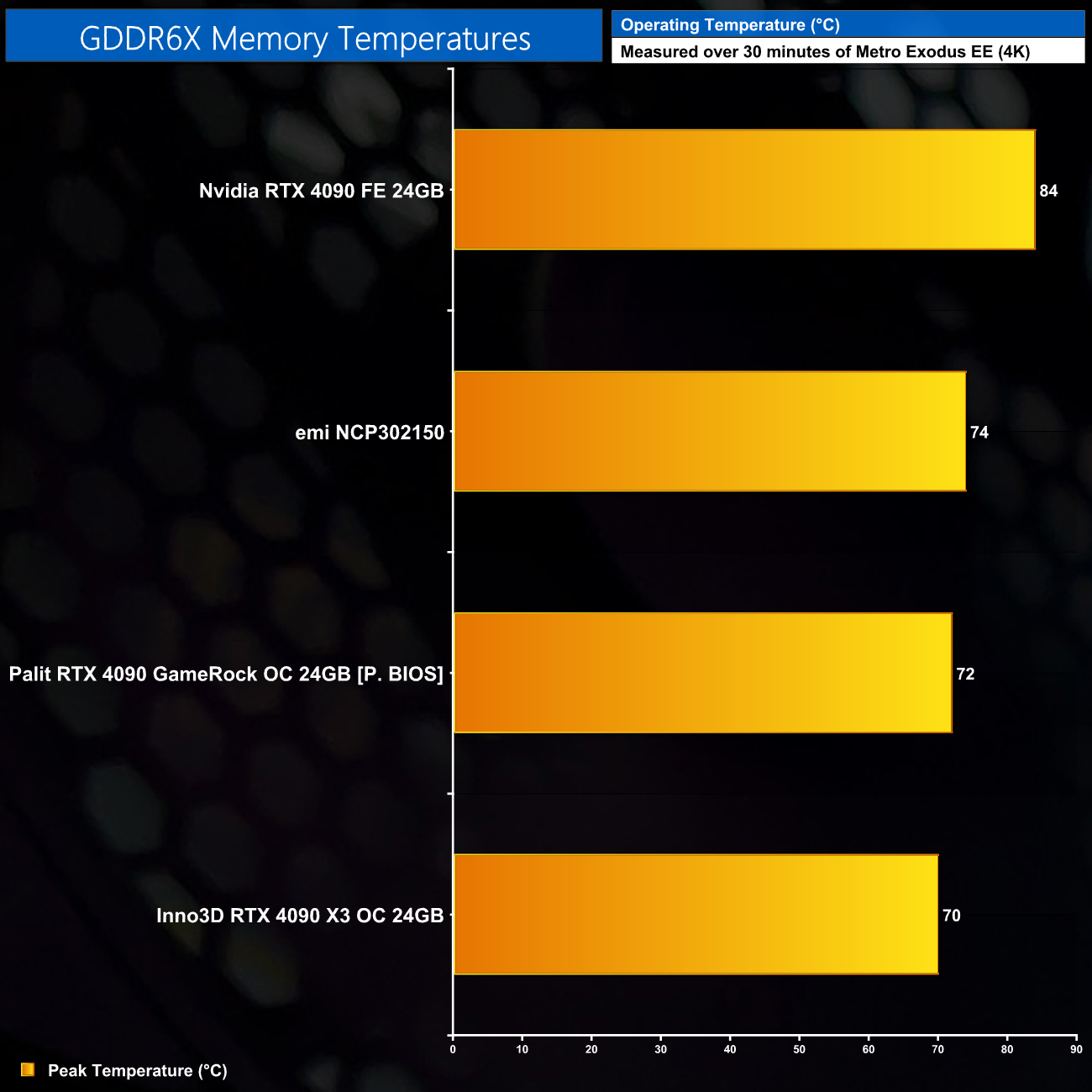 For our temperature testing, we measure the peak memory temperature under load. A reading under load comes from running Metro Exodus Enhanced Edition for 30 minutes.