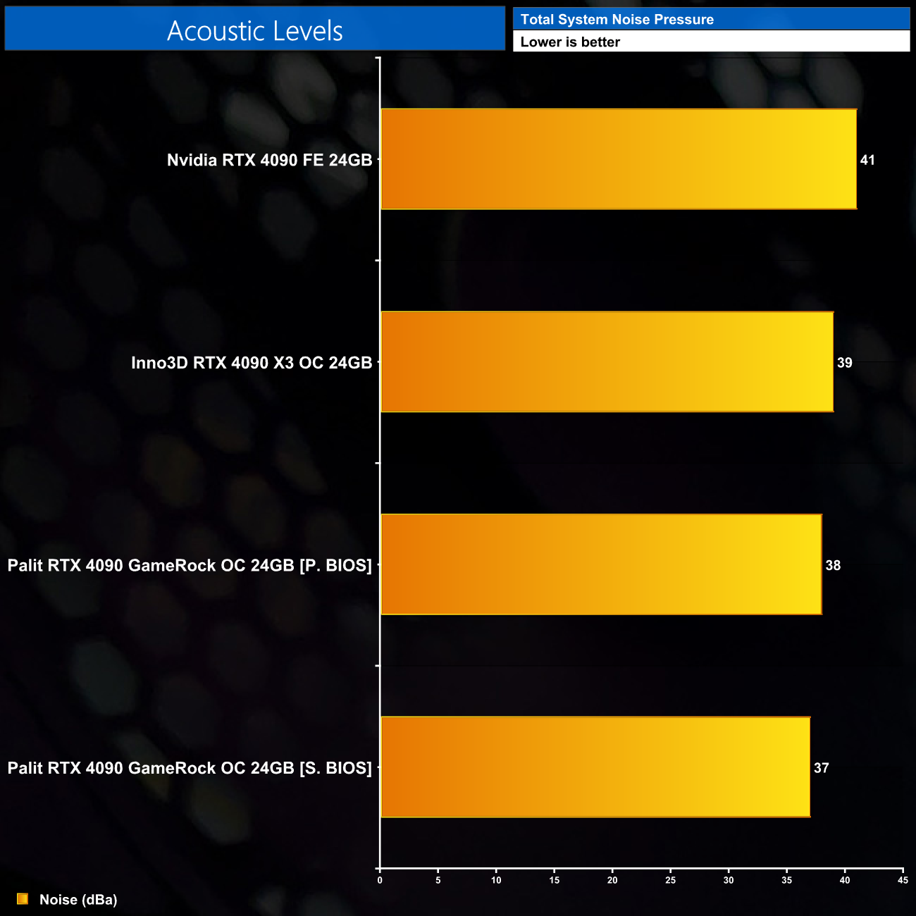 We note just a 1dBa difference in noise output between the two BIOS, with the Silent BIOS hitting 37dBa, compared to 38dBa for the Performance BIOS. That’s because the fans ran just 85rpm faster with the Performance BIOS in our testing, hitting 1520rpm, compared to 1435rpm in the Silent mode. That does make the GameRock OC the quietest RTX 4090 we've tested so far, but I’d have expected a bigger difference between the two BIOS modes.