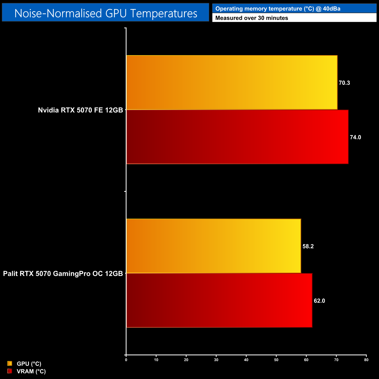 As expected, the GamingPro OC therefore offers significantly improved noise-normalised thermals compared to the FE, dropping both GPU and VRAM temperatures by 12C, a very impressive result.