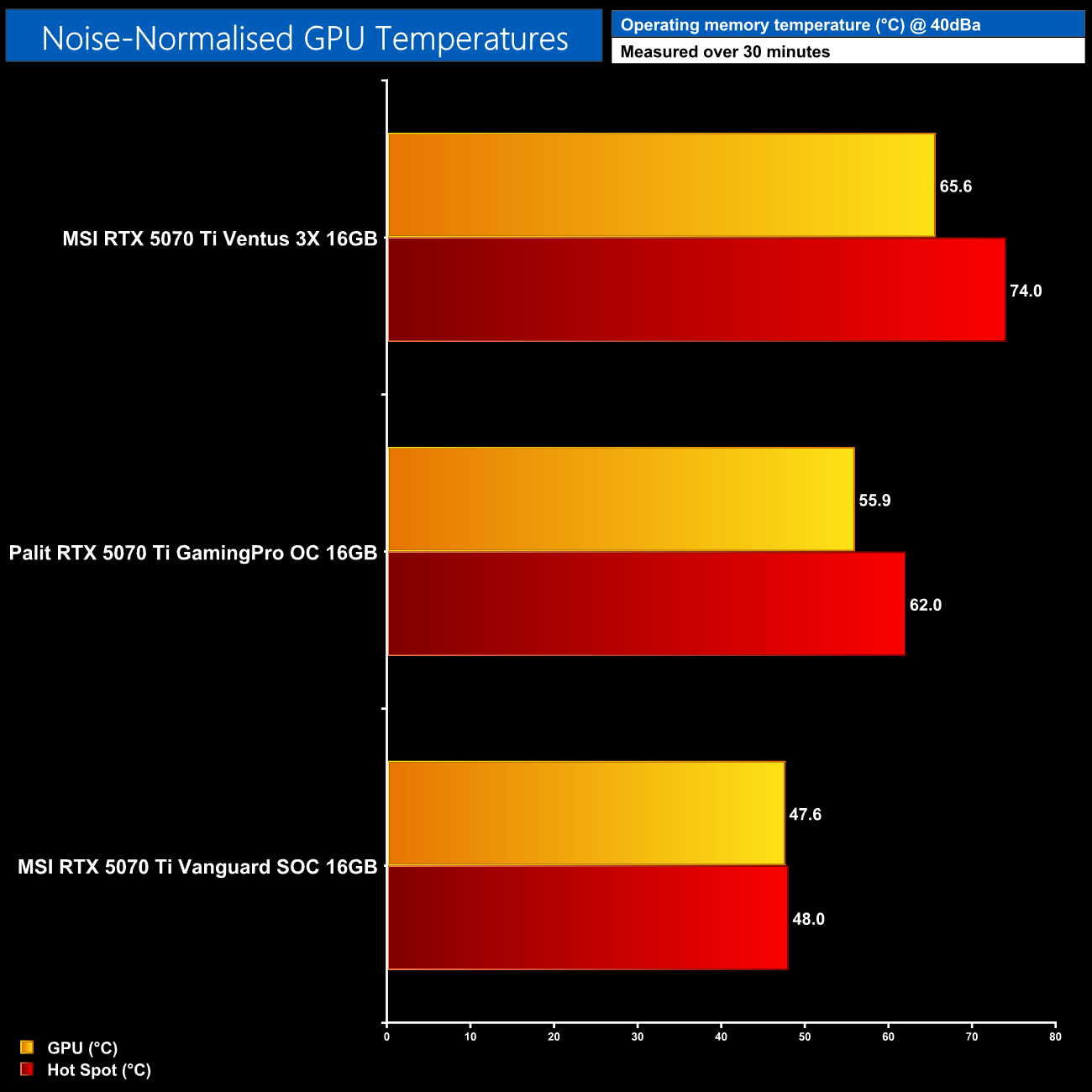 Noise normalised thermal performance continues the clear trend from our testing today, in that the GamingPro OC is a huge improvement over the Ventus 3X, reducing GPU and VRAM temperatures by 9.7C and 12C, respectively. However, it isn't a match for the much larger (and much more expensive) Vanguard SOC, which is in another class.