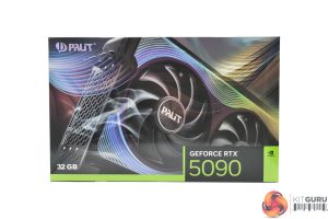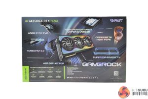 The Palit RTX 5090 GameRock ships in a colourful box, with a partial image of the graphics card visible on the front. On the back, the company highlights various key features of the card and its design.