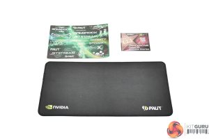 Palit bundles various accessories with the card, including some stickers, a small mousepad, a GPU holder, as well as the quad 8-pin to 12V-2X6 power adapter.