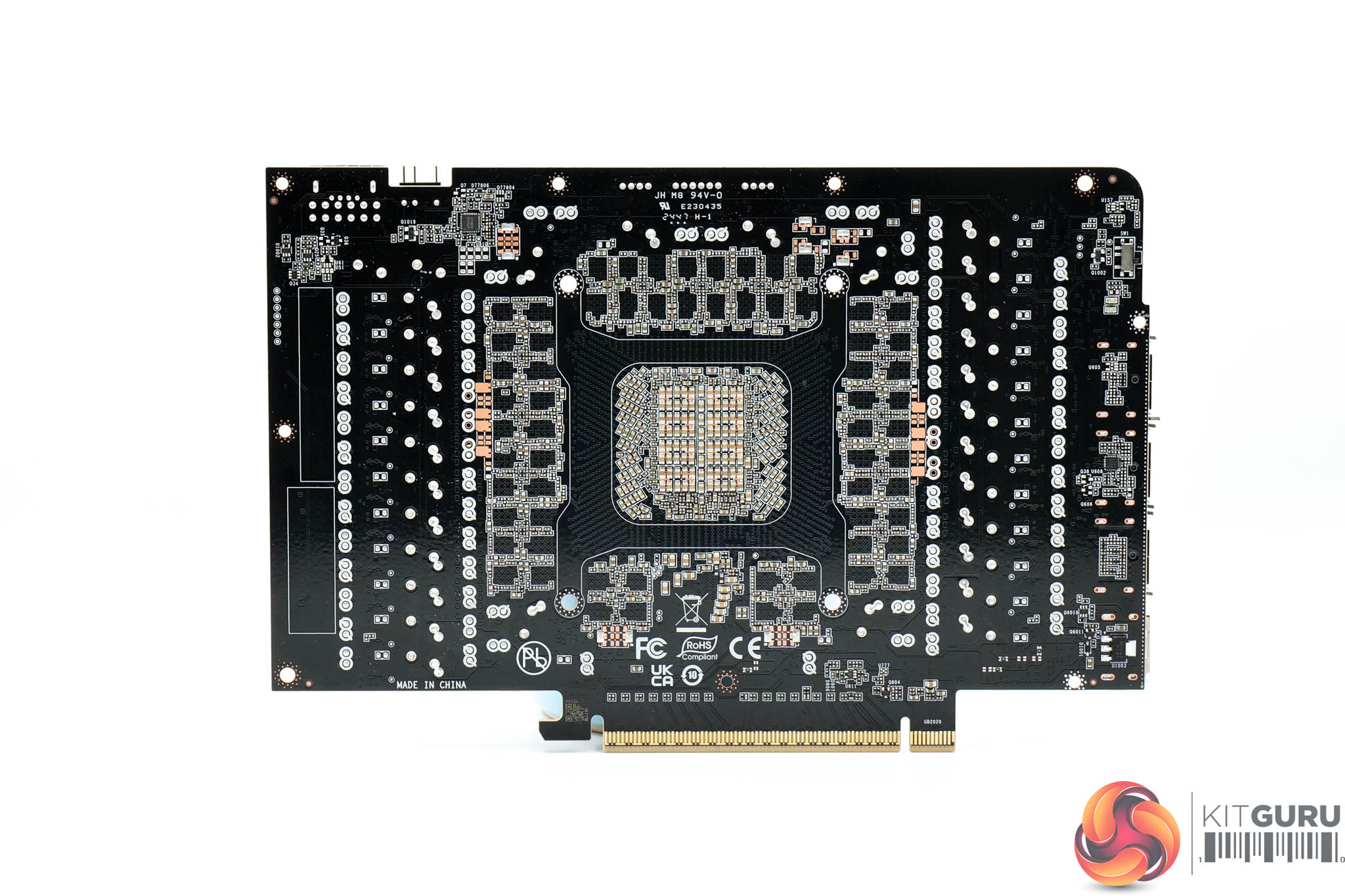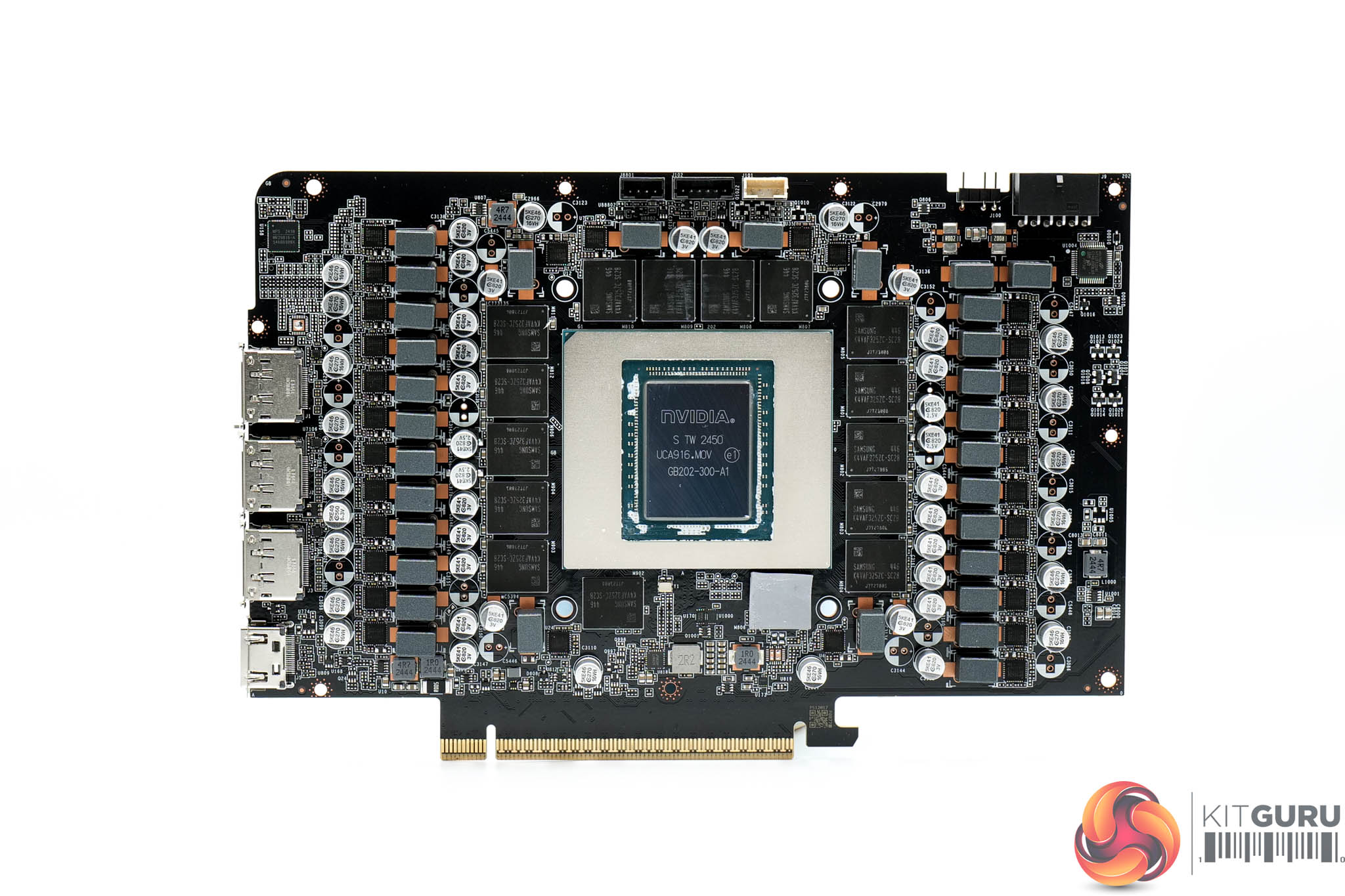 Then we get a look at the PCB itself. It's very densely packed, with no less than 22 phases for the GPU, and seven for the memory. Monolithic Power Systems MP87993 MOSFETs are used throughout, and these are rated at 50A. I could only see one controller on the PCB too, Monolithic's MP29816-A, so it would seem this is used for both memory and GPU VRMs.