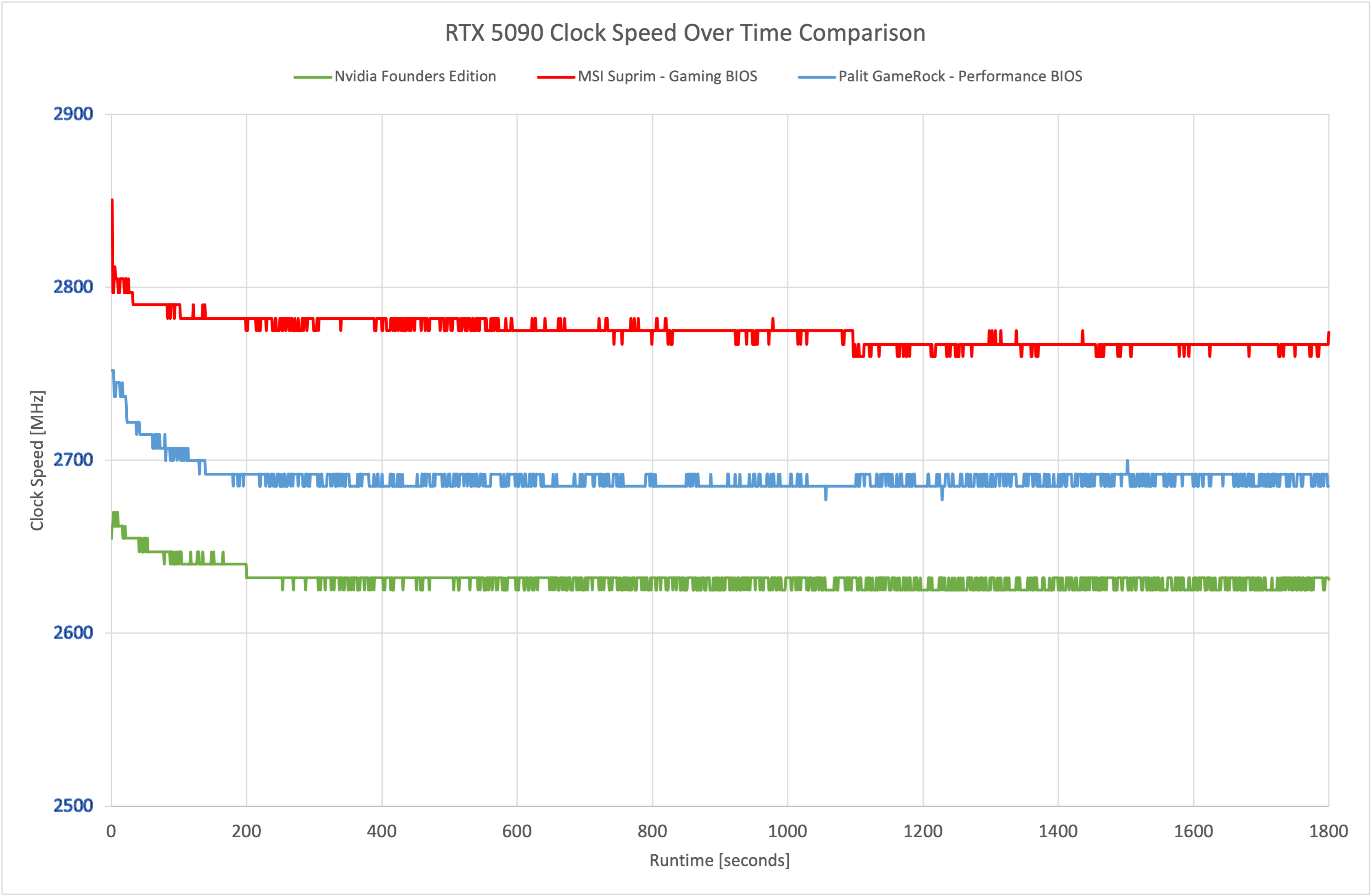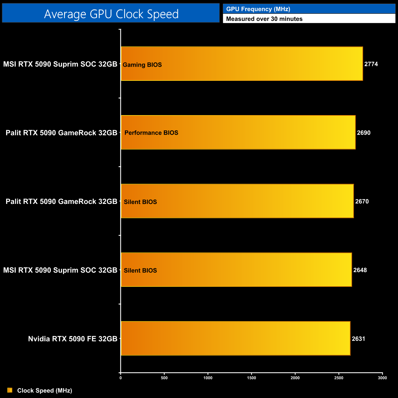 Despite sharing the same rated clock speed as the 5090 Founders Edition – as both use the reference spec – we actually saw the GameRock running faster during our clock speed testing. The difference isn't huge, but it was measurable as you can see here.