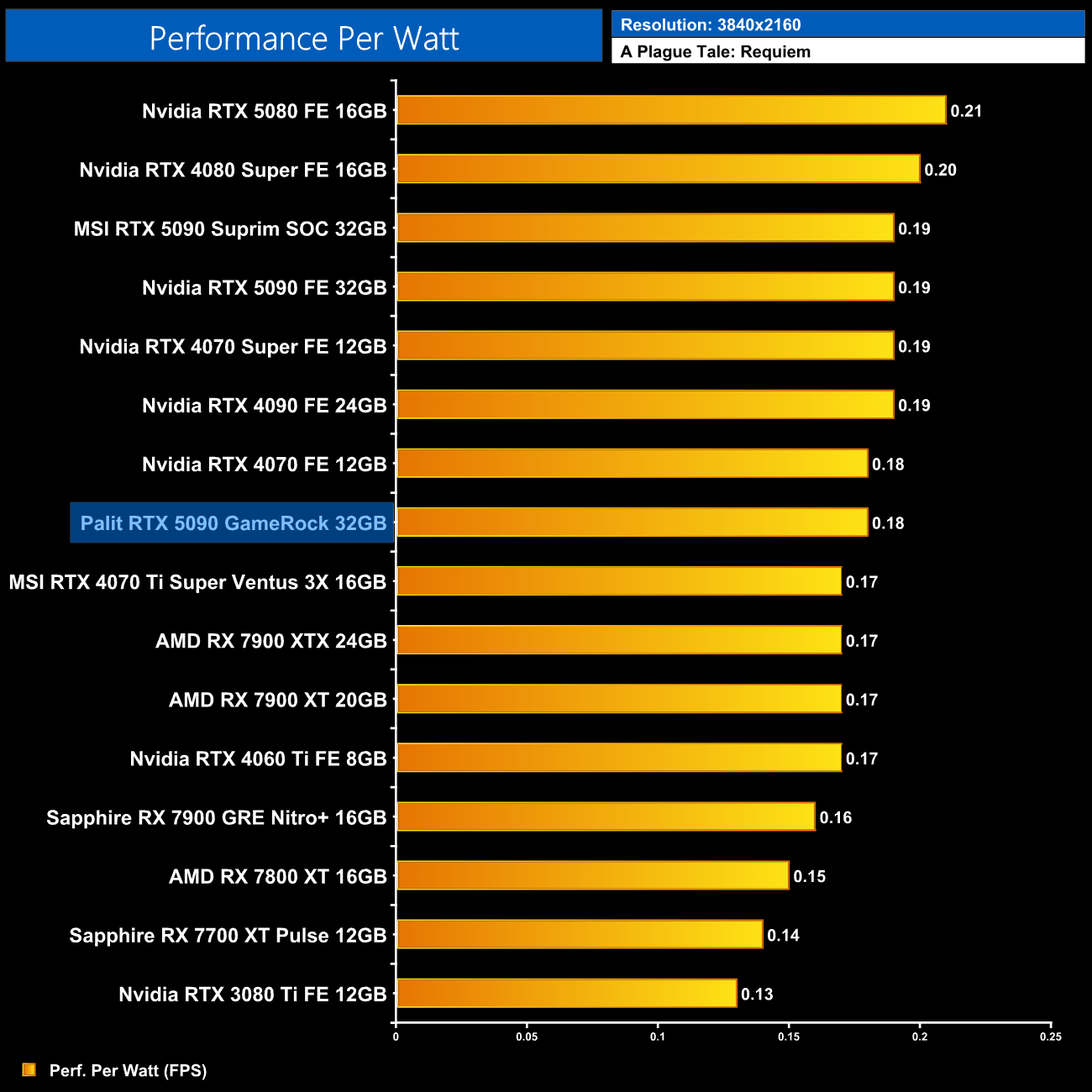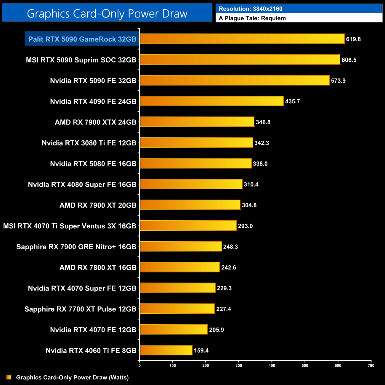 Somewhat staggeringly, power draw for the GameRock is even higher than I was expecting. On paper the card has a 575W TGP, and Palit has not increased the power limit. Despite that, we saw real-world power draw hitting just under 620W in A Plague Tale: Requiem, nearly a 50W increase over the Founders Edition.
