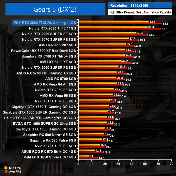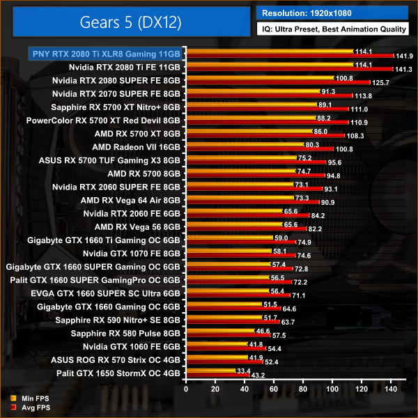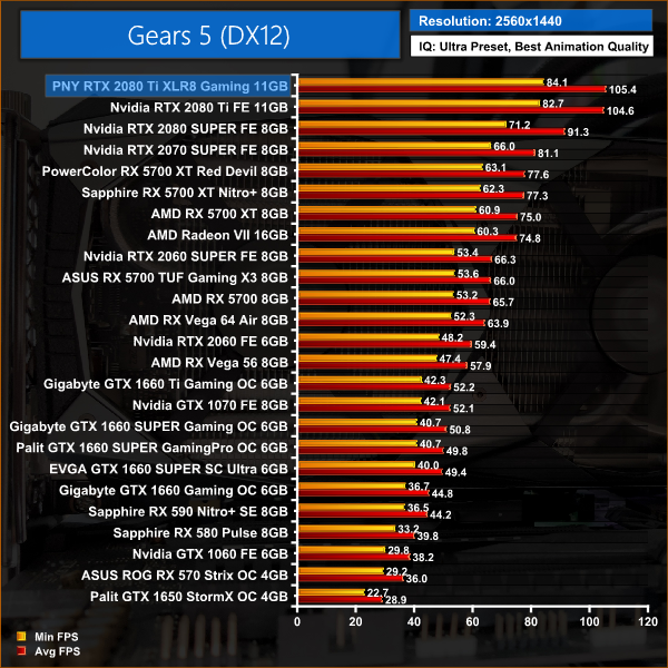 Gears 5 is a recent release and is a great benchmarking tool, with plenty of settings available to tweak. At 1440p this card is capable of delivering over 100FPS on average, while 4K/60 gameplay is also achieved with Ultra settings.