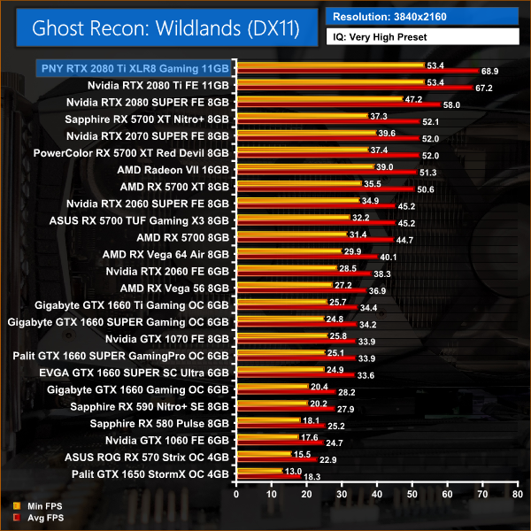 Despite being an older title, Wildlands is still a stern test for modern GPUs and we see that with results very similar to Gears 5 – over 100FPS on average at 1440p, with 4K gameplay offering 68FPS average, with minimums of 53FPS.