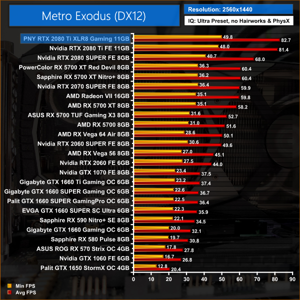 Metro Exodus is a punishing title to run with Ultra settings, particularly when using the game's built-in benchmark. Here, though, the XLR8 comes out on top at every resolution tested, offering 4% increased performance at 4K versus the Founders Edition.