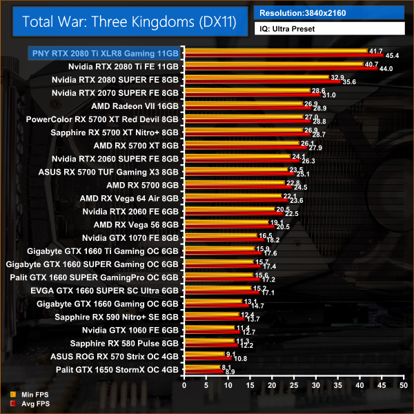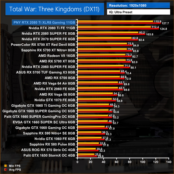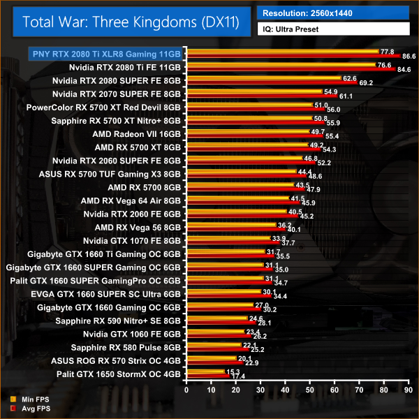 Total War: Three Kingdoms is a resource-heavy title which can sap a GPU, especially at 4K. There we saw the XLR8 2080 Ti average 45FPS, with 1440p gaming offering almost 90FPS on average.