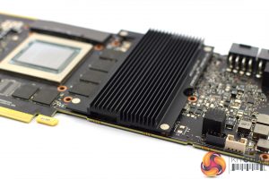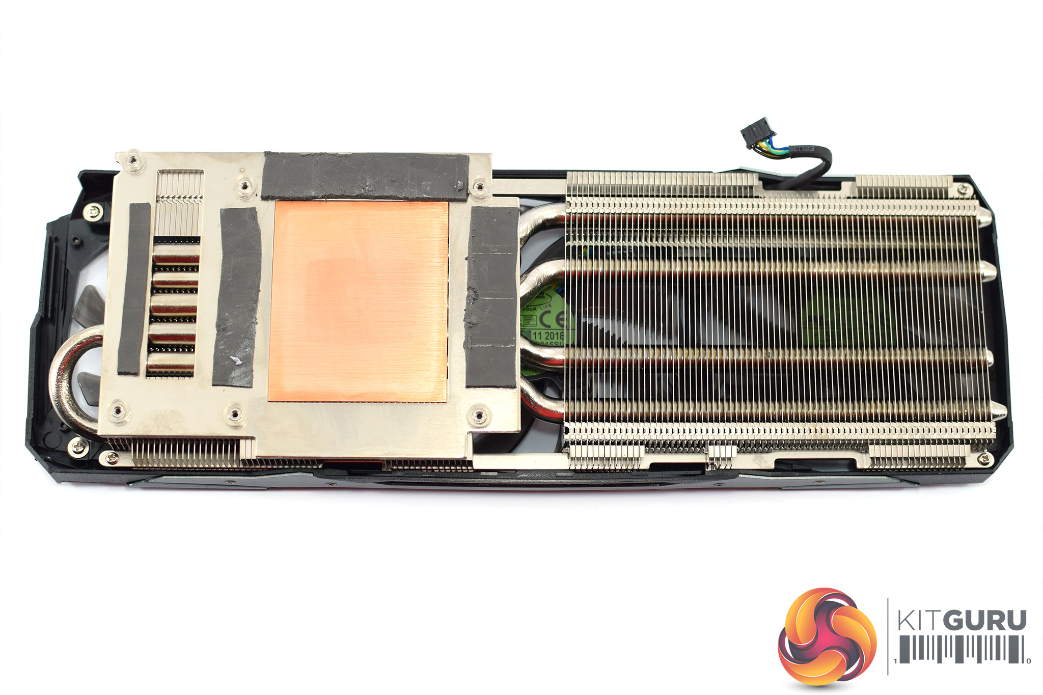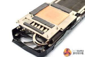 As for the cooler, this is comprised of two separate fin stacks which are connected by five heatpipes – 4x 8mm and 1x 6mm. The GPU itself contacts with a copper coldplate, but there is a separate plate for the VRAM modules and the VRM positioned to the left of the GPU (i.e, the MOSFETs not covered by the finned heatsink).