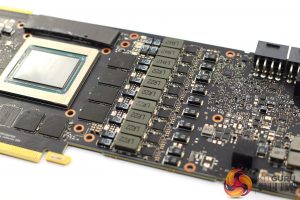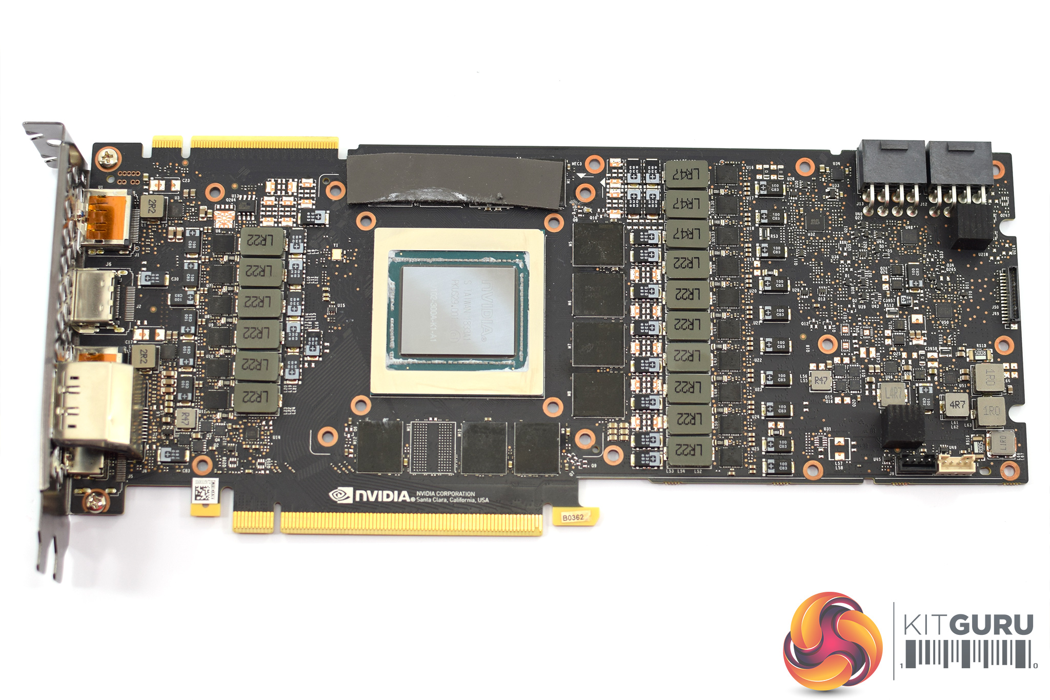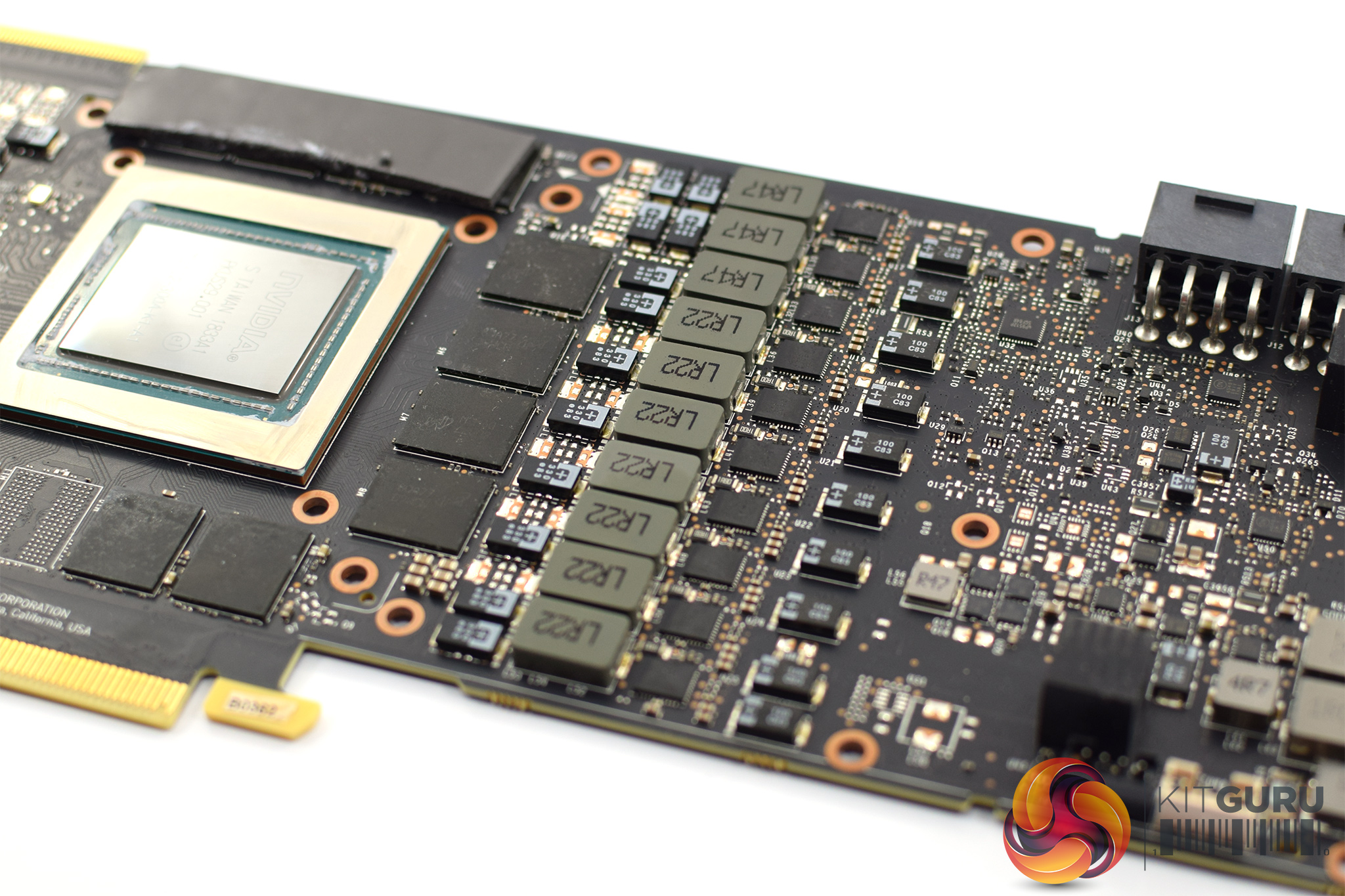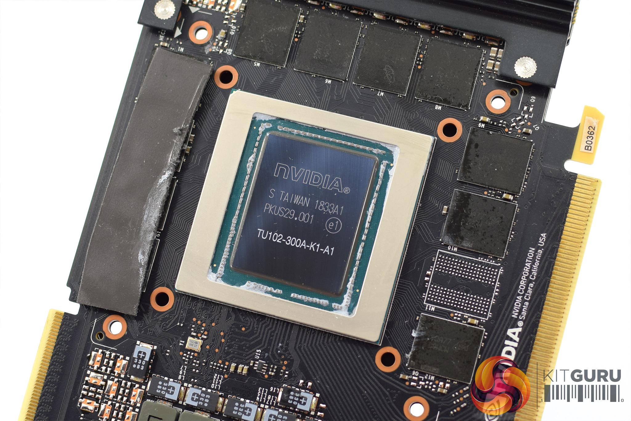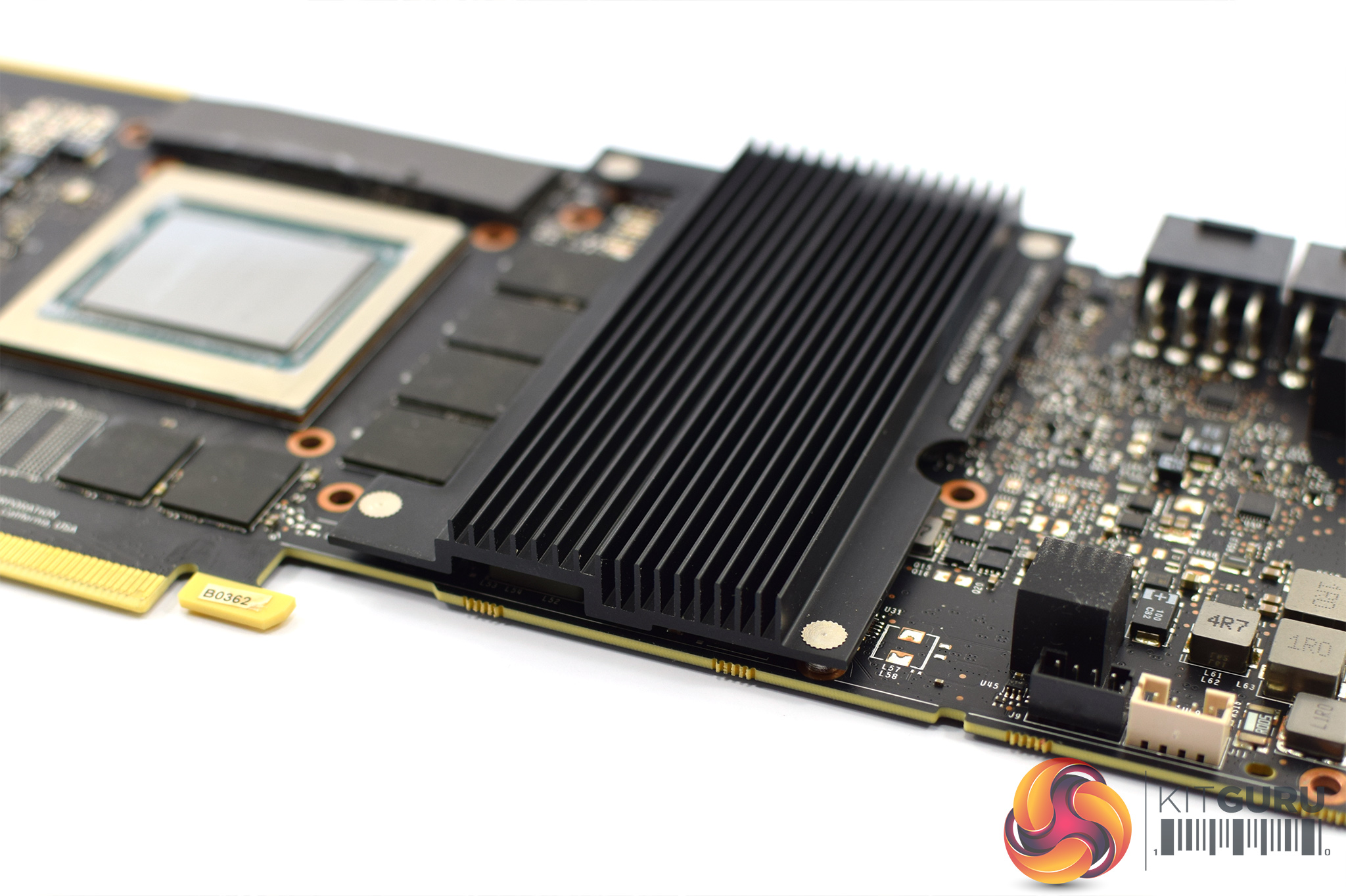 Prising off the cooler only requires the removal of six screws, and then we can get a look at the PCB. We'll look at the VRM in more detail below, as PNY has fitted a finned heatsink on top of the right-hand side MOSFETs and chokes which is a nice touch, but starting with the memory it is no surprise to see the modules coming from Micron, each one labelled ‘8QA77D9WCW.' We can also see the big TU102 GPU, labelled ‘TU102-300A-K1-A1'.