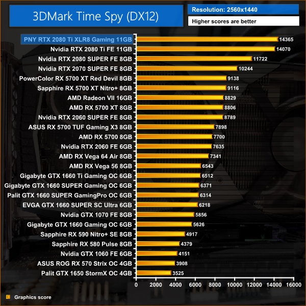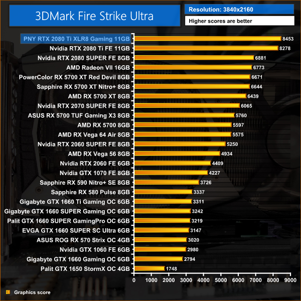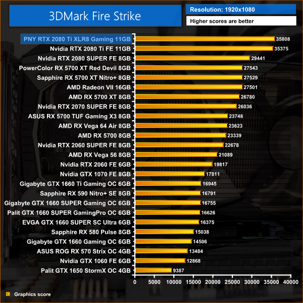 As expected, the PNY 2080 Ti XLR8 Gaming claims top spot in all three of our 3DMark benchmarks, outperforming the 2080 Ti Founders Edition (FE) by 2%.