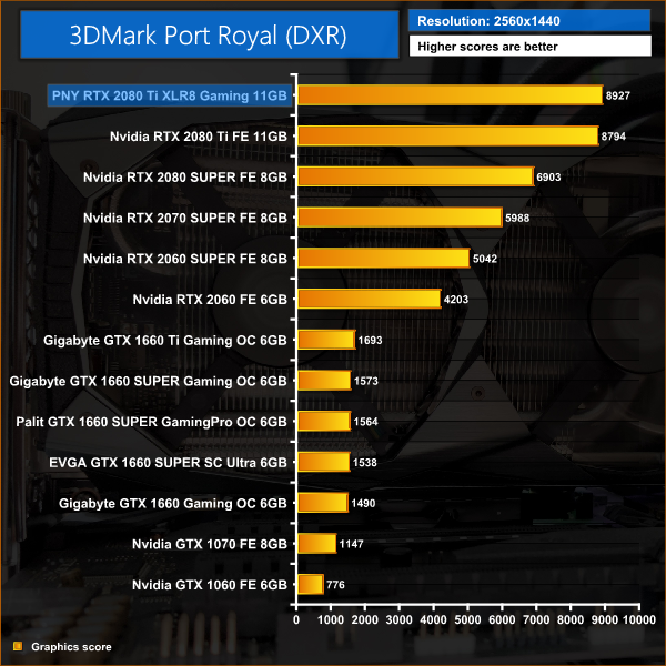 Port Royal is designed specifically to test a card's ray tracing abilities, with the XLR8 out-pointing the Founders Edition by over 130 points. Compared to 2080 SUPER, the gap is almost 2000 points.