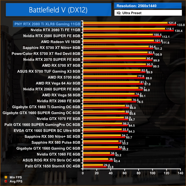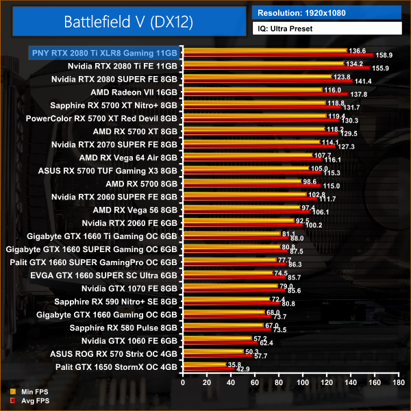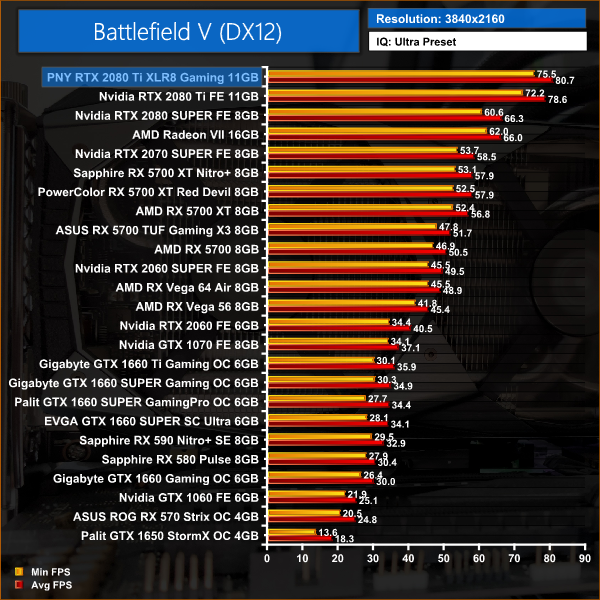 Battlefield V is a well optimised title and allows the 2080 Ti to really stretch its legs, delivering almost 160FPS with Ultra settings at 1080p. 4K gamers will also see a solid 80FPS average from the PNY XLR8.