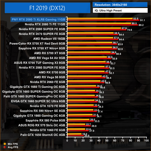 F1 2019 is a less demanding title than some others we test, and accordingly the XLR8 reaches almost 200FPS average at 1080p, even using Ultra High settings. 4K gamers would even get good mileage out of a pricy 4K/144Hz monitor, with this card averaging 91FPS at 2160p.