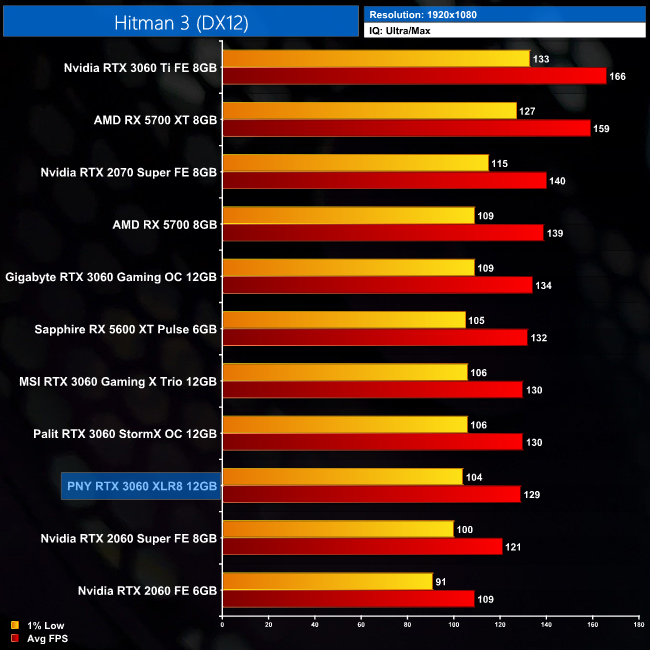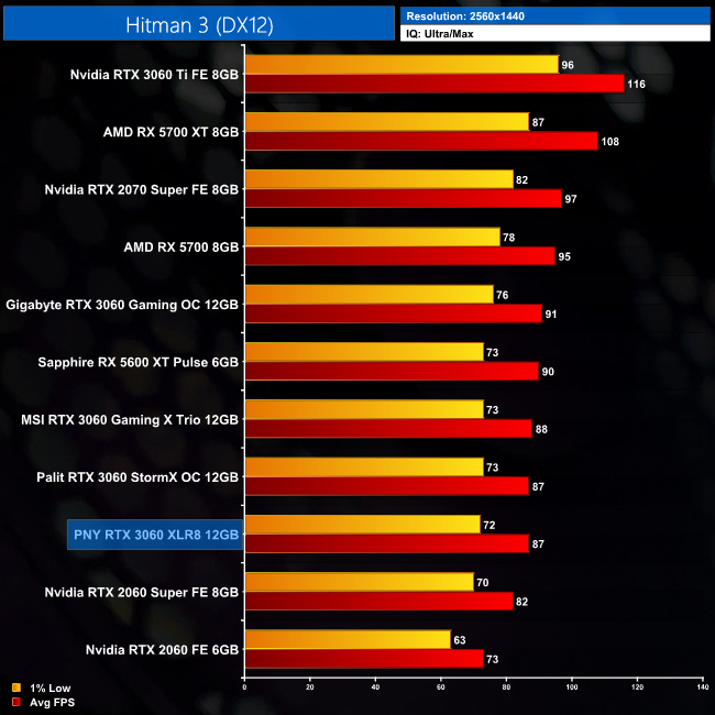 Hitman 3 sees the XLR8 average 129FPS at 1080p, which is not meaningfully slower than the other RTX 3060s we have tested. At 1440p as well, it averaged 87FPS which is dead level with the StormX OC.