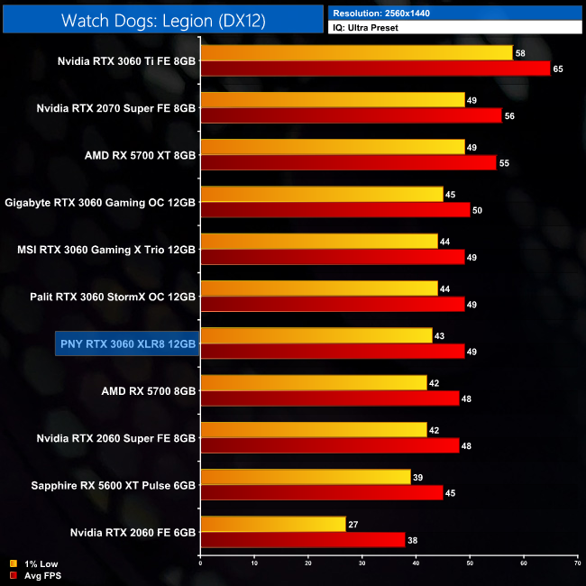 Finally we come to Watch Dogs: Legion. This is another title where extra clock speed doesn't make much difference at all, with every RTX 3060 tested averaging 64FPS at 1080p. Up at 1440p, the XLR8 is level with the StormX OC, and only 1FPS behind the Gigabyte Gaming OC.