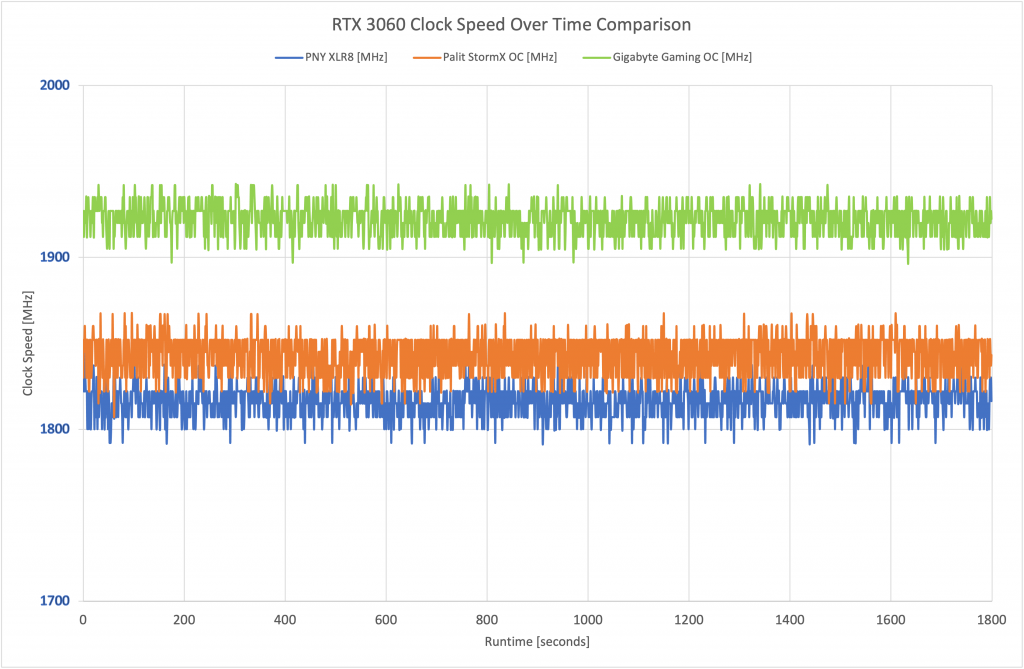 Looking at the average operating clock frequency of the XLR8, it becomes clear why we did see this card running a touch slower than the other RTX 3060s during our game benchmarks. It averaged 1816MHz, roughly 25MHz slower than the Palit StormX, but over 100MHz slower than the Gigabyte Gaming OC, which is the fastest RTX 3060 we have tested to-date. The differences aren't massive, and they are to be expected considering the XLR8 isn't factory overclocked, but it does explain why we saw the gaming performance results that we did.