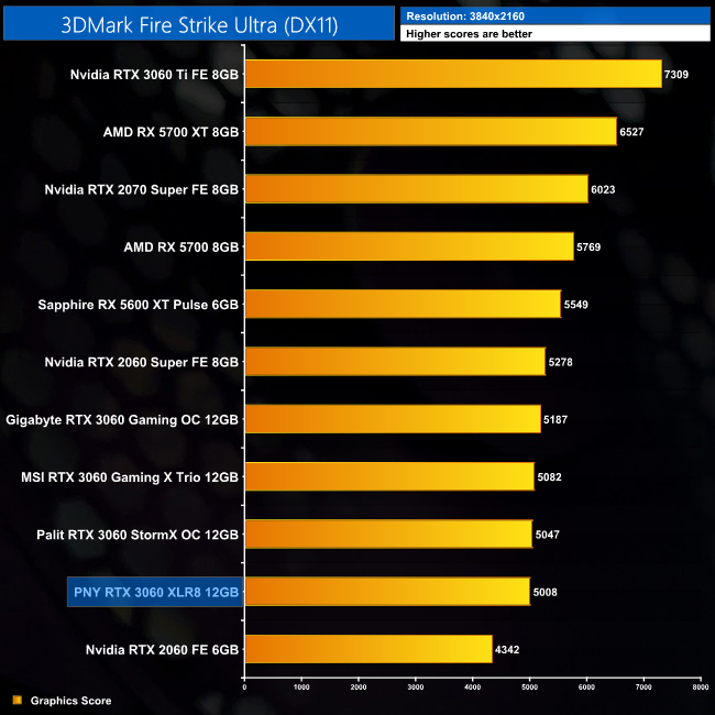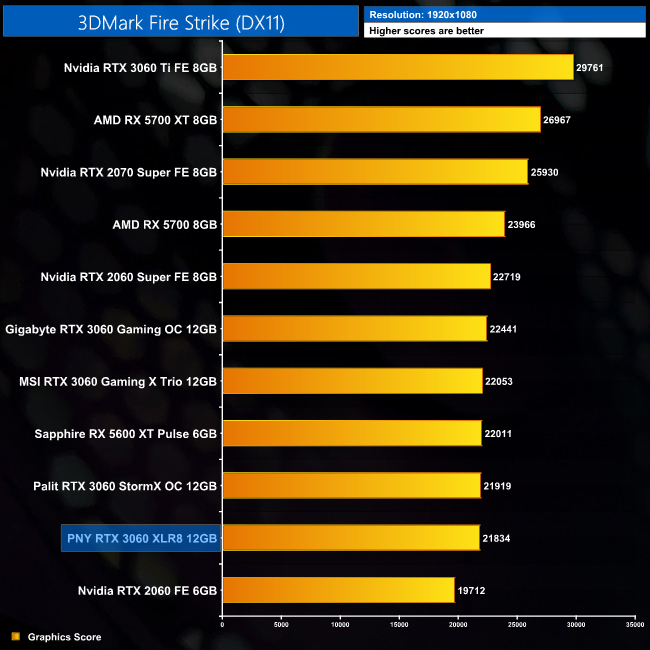Kicking off with our 3DMark benchmarks, overall scores for the PNY RTX 3060 XLR8 are a touch below the other RTX 3060s we have reviewed, though not by much – it's just 1% slower than the Palit StormX OC in the Time Spy benchmark.