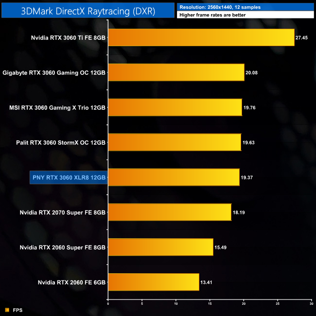The same goes for the DXR feature test, where the XLR8 comes in 1% slower than the StormX OC, but 4% slower than Gigabyte's highly-clocked RTX 3060 Gaming OC model.