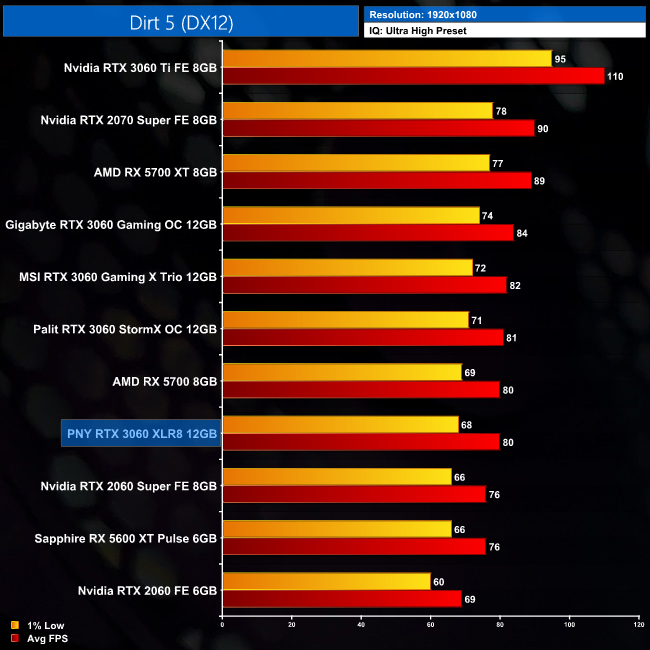 As for Dirt 5, here we can see the XLR8 again slightly behind the other RTX 3060s. At 1080p it's just a single frame off the pace, but at 1440p it fell 2FPS behind the StormX OC and 4FPS behind the Gaming OC.