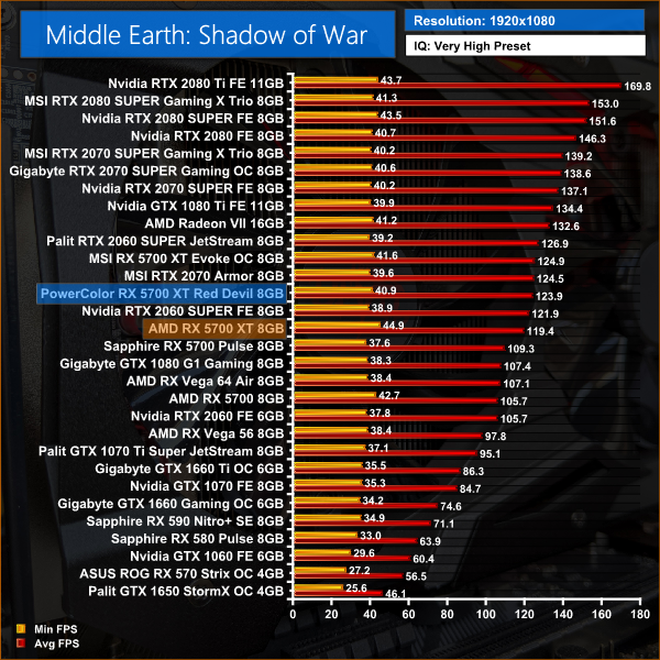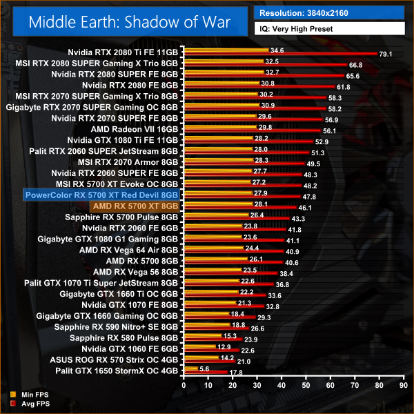 PowerColor's Red Devil is 4% faster than the reference card across every resolution tested when playing Middle Earth: Shadow of War.