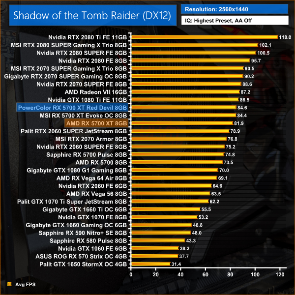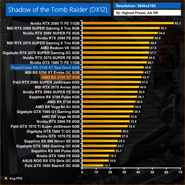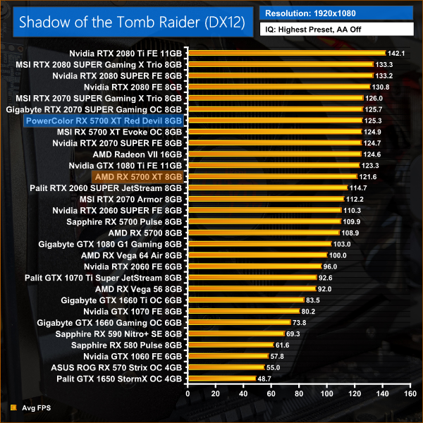 It's more of the same in Shadow of the Tomb Raider, with 3% performance uplift on average for the Red Devil versus the reference card. Its performance is essentially identical to MSI's Evoke OC.