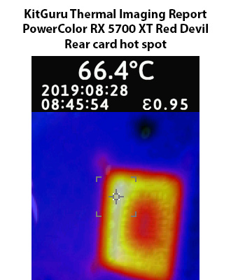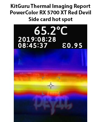 The above thermal images were taken with the card using the OC BIOS, and clearly there is nothing to worry about, with hot spots on the side and rear of the card hovering around the 65C mark.