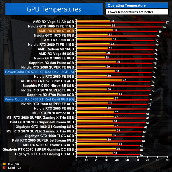 For our temperature testing, we measure the peak GPU core temperature under load, as well as the GPU temperature with the card idling on the desktop. A reading under load comes from running the 3DMark Fire Strike Ultra stress test 20 times. An idle reading comes after leaving the system on the Windows desktop for 30 minutes.