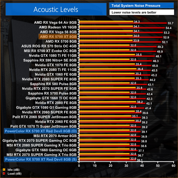 This is where things get very interesting for the Red Devil. Even with the OC BIOS – running 115MHz faster and 9C cooler than reference – noise levels are fantastic, barely reaching 39dB. This means the card is barely audible under load, with the fans spinning at around 1460rpm – 41% – for the majority of our stress test.