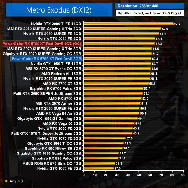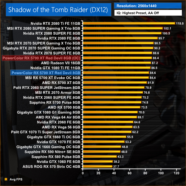This overclock bumped up our frame rates by another 4%, so it's certainly nothing stellar but then again you'd still take it over stock performance. Versus the reference 5700 XT, the manually overclocked Red Devil averaged 8% higher frame rates across these three titles.