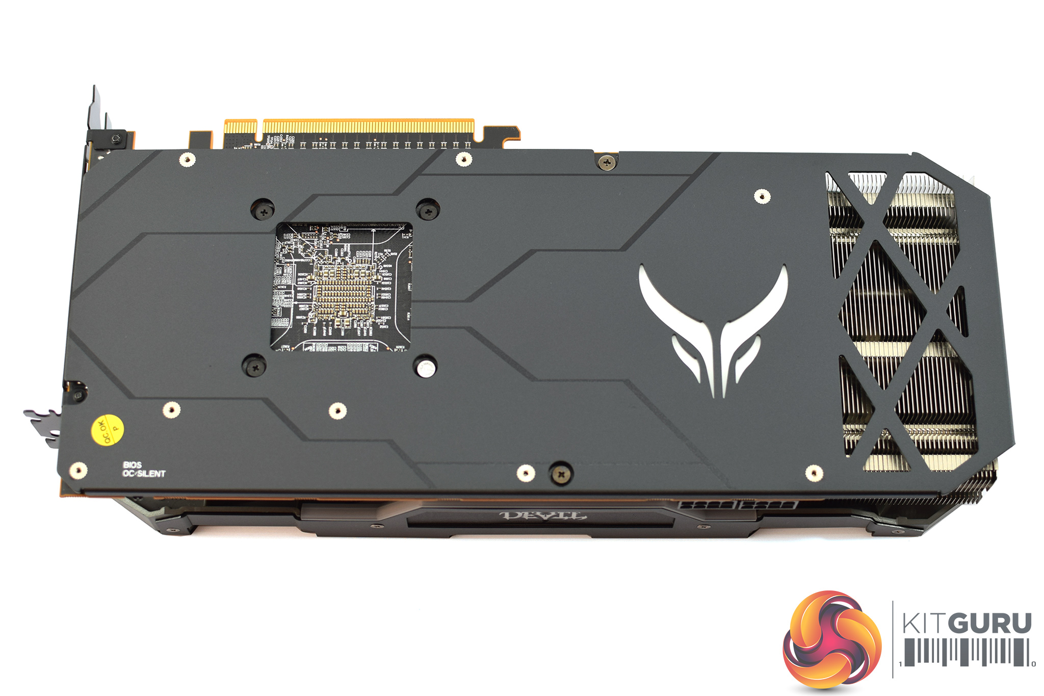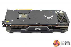 PowerColor have also fitted an attractive backplate to the Red Devil. It's made of metal and PowerColor says it measures 1.5mm thick, though you can see the cut-out behind the GPU core. There's also an interesting grille/mesh section at the end, designed to increase ventilation from the back of the card. Lastly, the logo positioned just to the left of that grille section is another RGB zone.